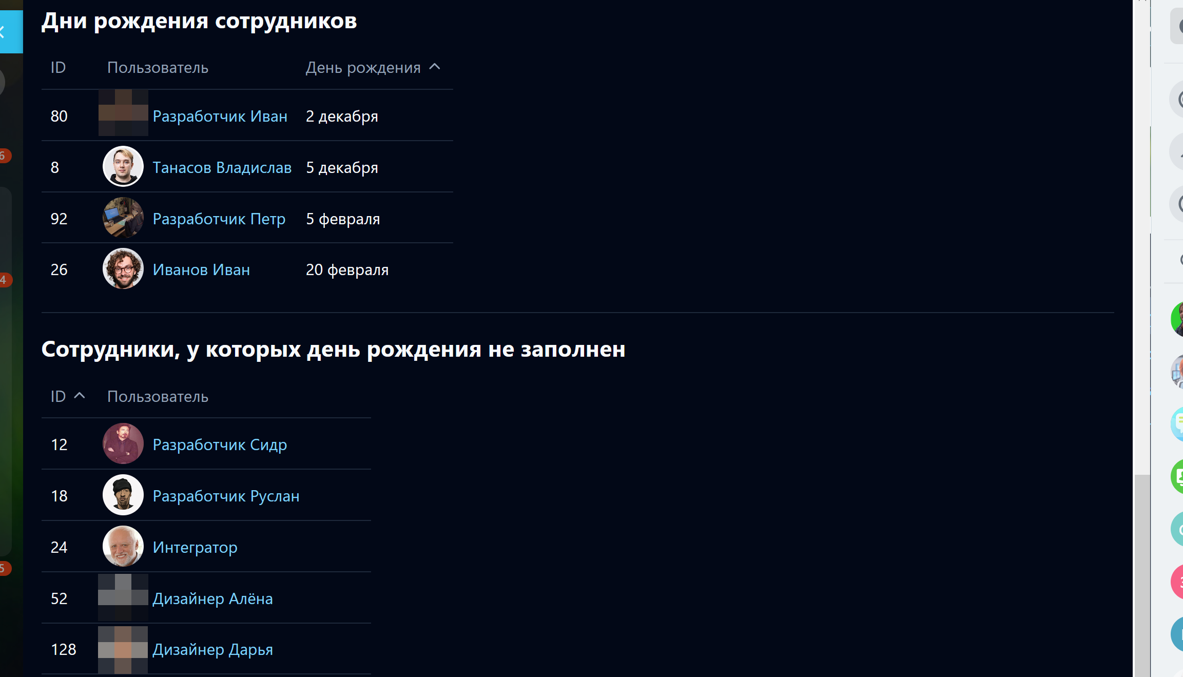 - Таблица "Сотрудники, у которых день рождения не заполнен".