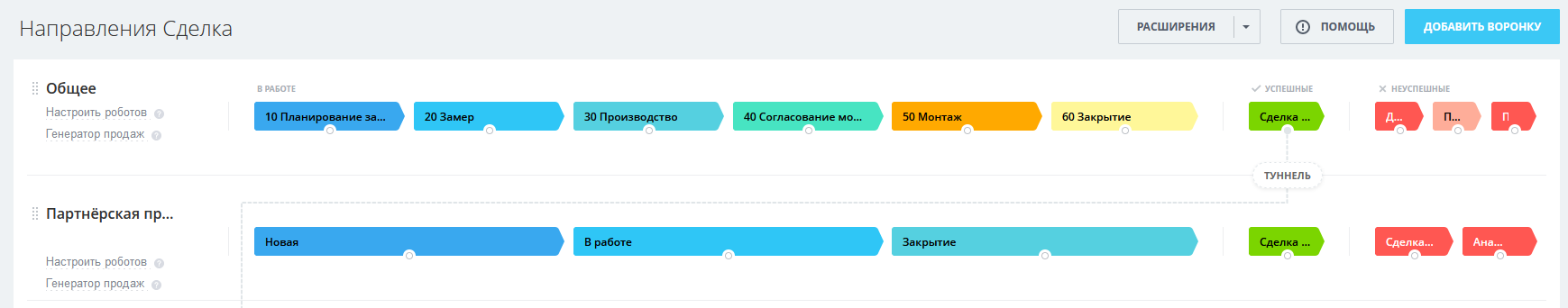 - Одна воронка продаж, менеджеру легко в ней работать, не нужно переключаться