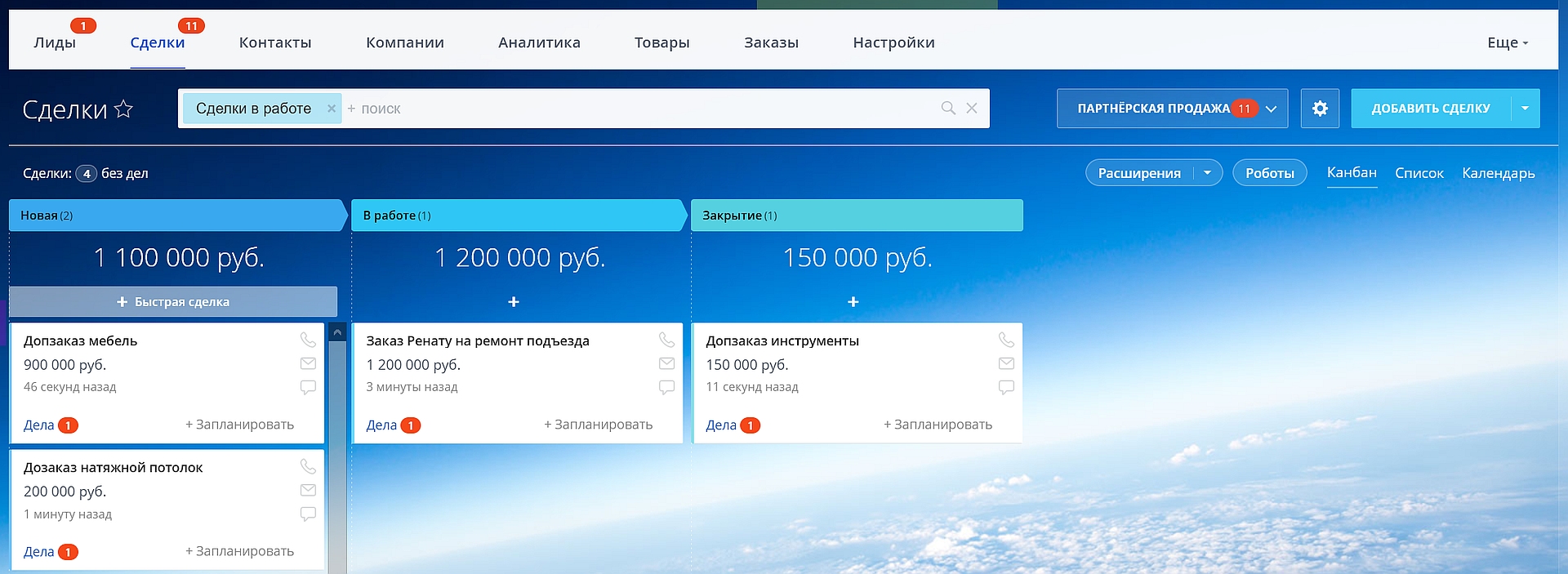 - Профессиональный, Команда (архивный) и Компания (архивный): авто-названия лидов и сделок, автоматический расчет Прибыли и Рентабельности, вторая воронка сделок для контроля агентских вознаграждений (вы ведь отдаете заявки на потолки/балконы/ремонт другим бригадам)