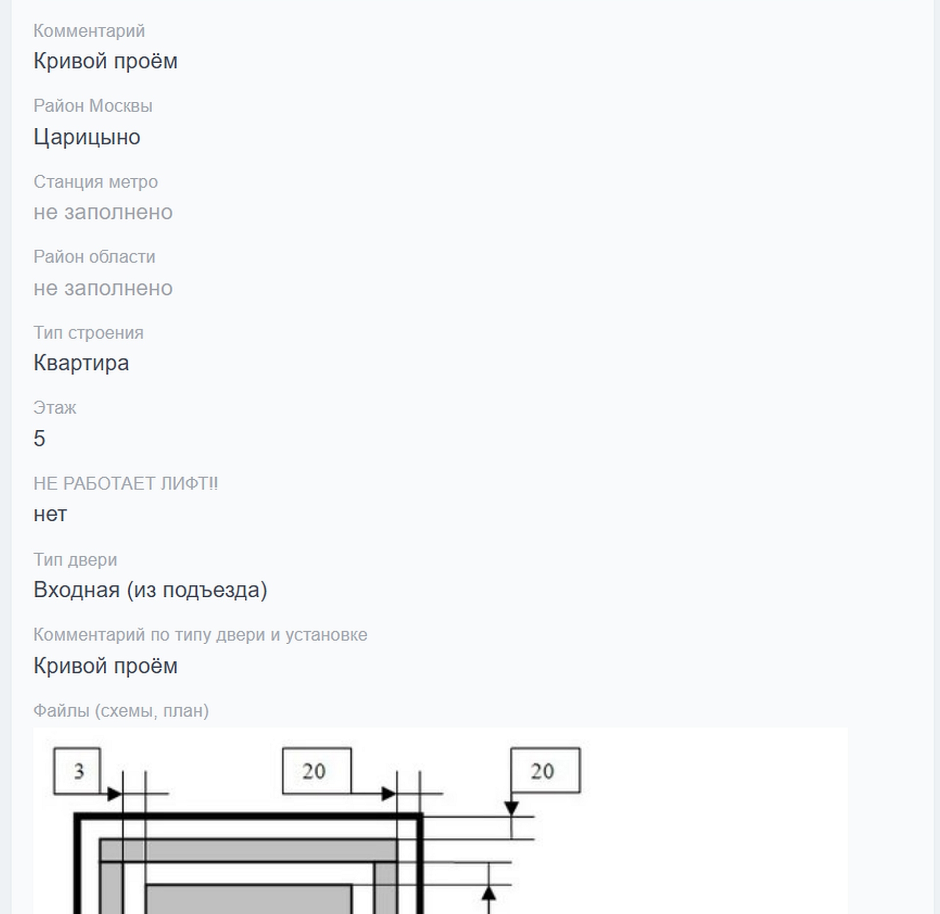 Район Москвы, Станция метро, Район области, Адрес монтажа, Дата замера, Замерщик, Тип строения, Этаж, НЕ РАБОТАЕТ ЛИФТ!!, Тип двери, Комментарий по типу двери и установке, Файлы (схемы, план), Дата монтажа, Дата закрытия сделки, Фотографии, Отзыв заказчика, Комментарий по результатам монтажа, Закрывающие документы, Монтажник, Сделка - партнёрская продажа, Предоплата на замере, Постоплата на монтаже, Расходы, Доход*, Рентабельность%*