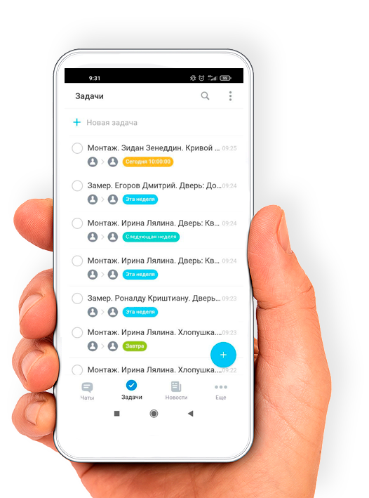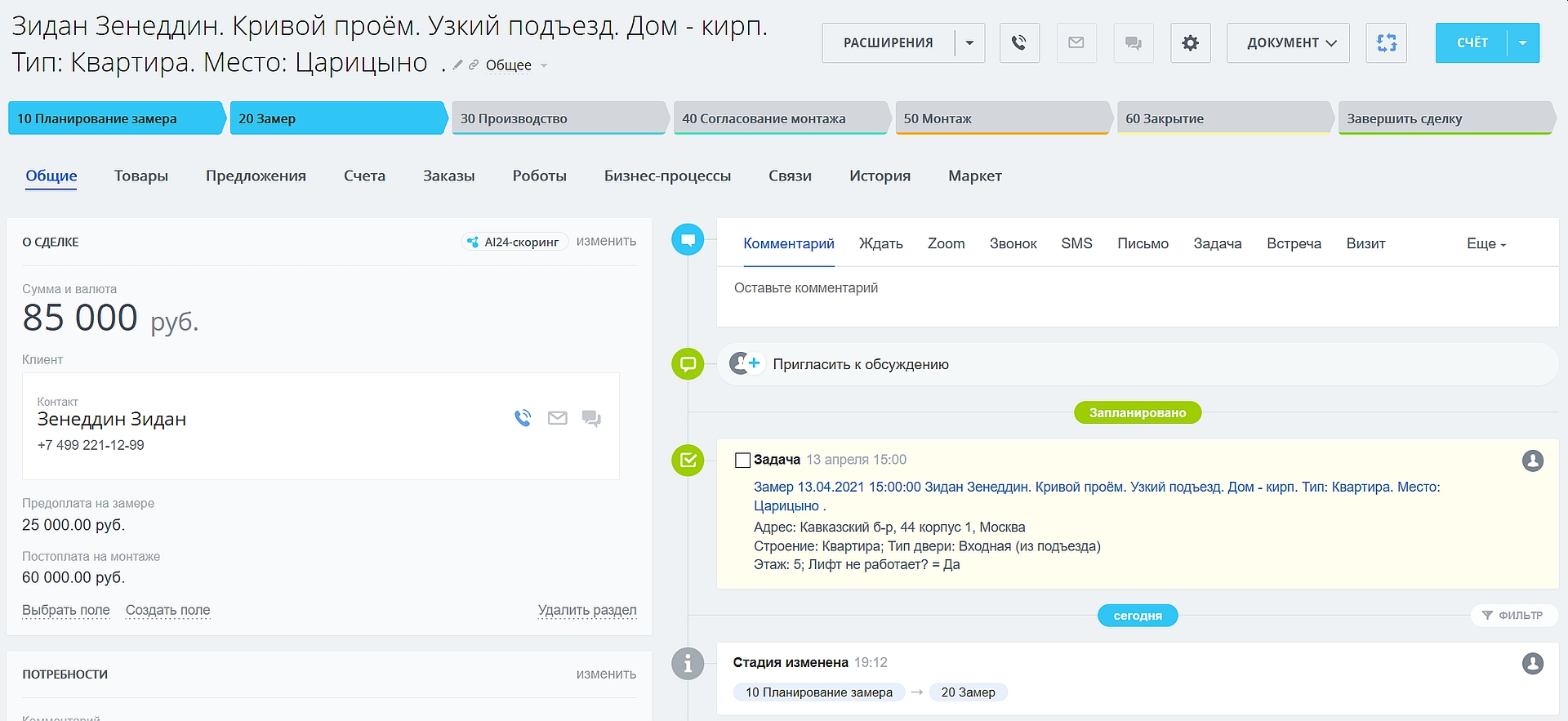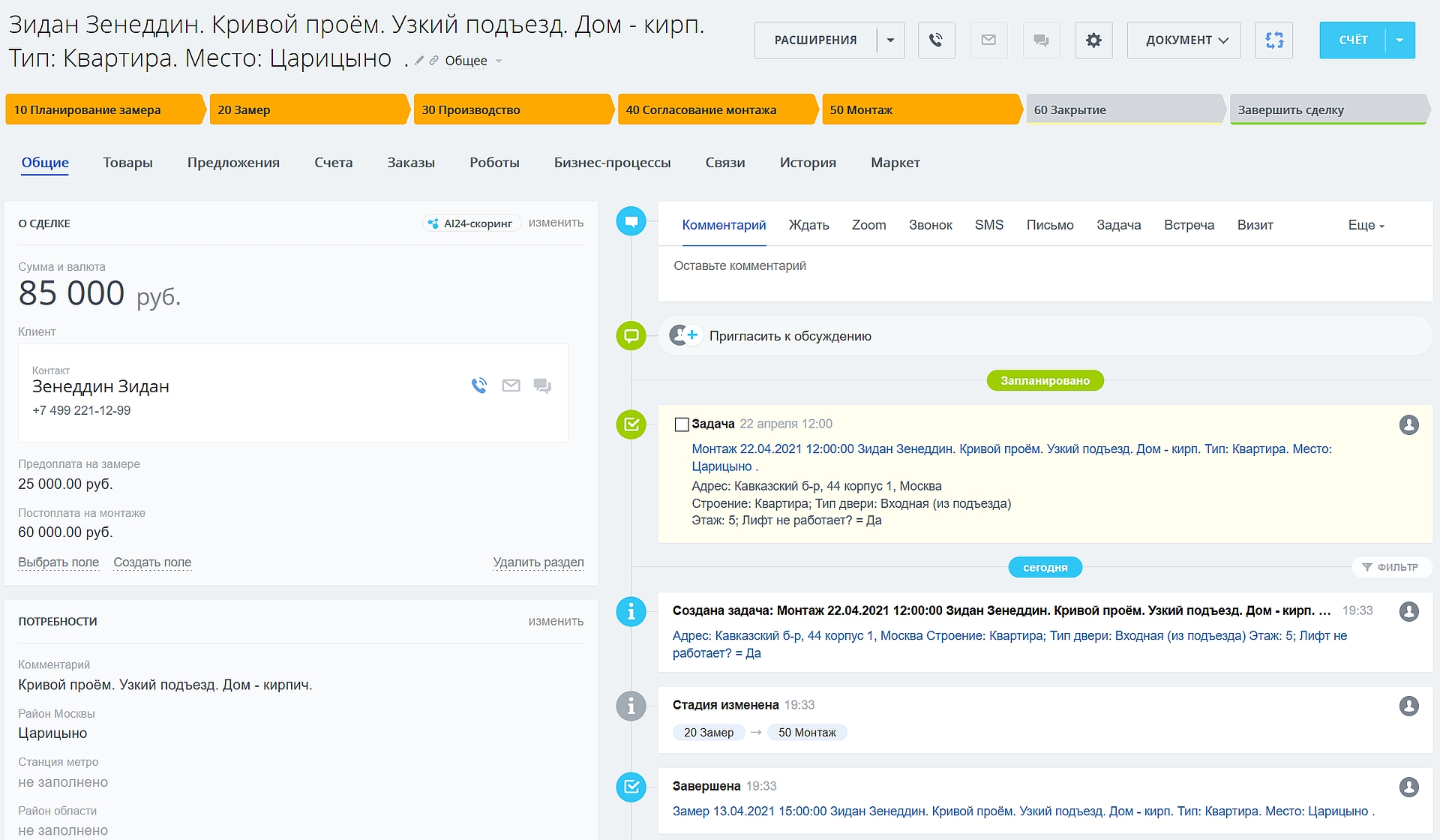 - Специалисты (замер/монтаж) работают в задачах - они отлично могут работать с мобильного телефона. Задачи ставятся автоматически, а выполнение задач автоматически передвигает стадию в сделке