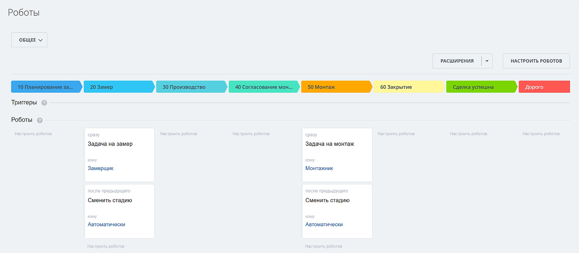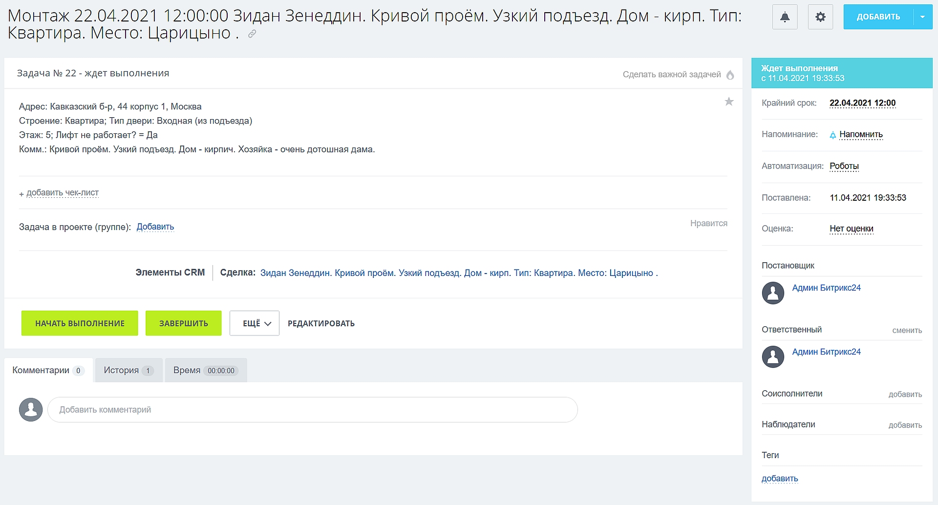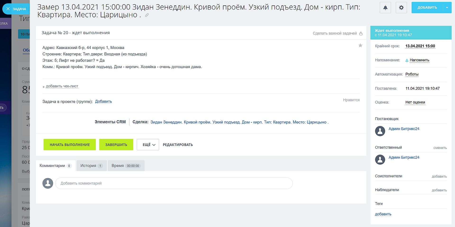 - Специалисты (замер/монтаж) работают в задачах - они отлично могут работать с мобильного телефона. Задачи ставятся автоматически, а выполнение задач автоматически передвигает стадию в сделке