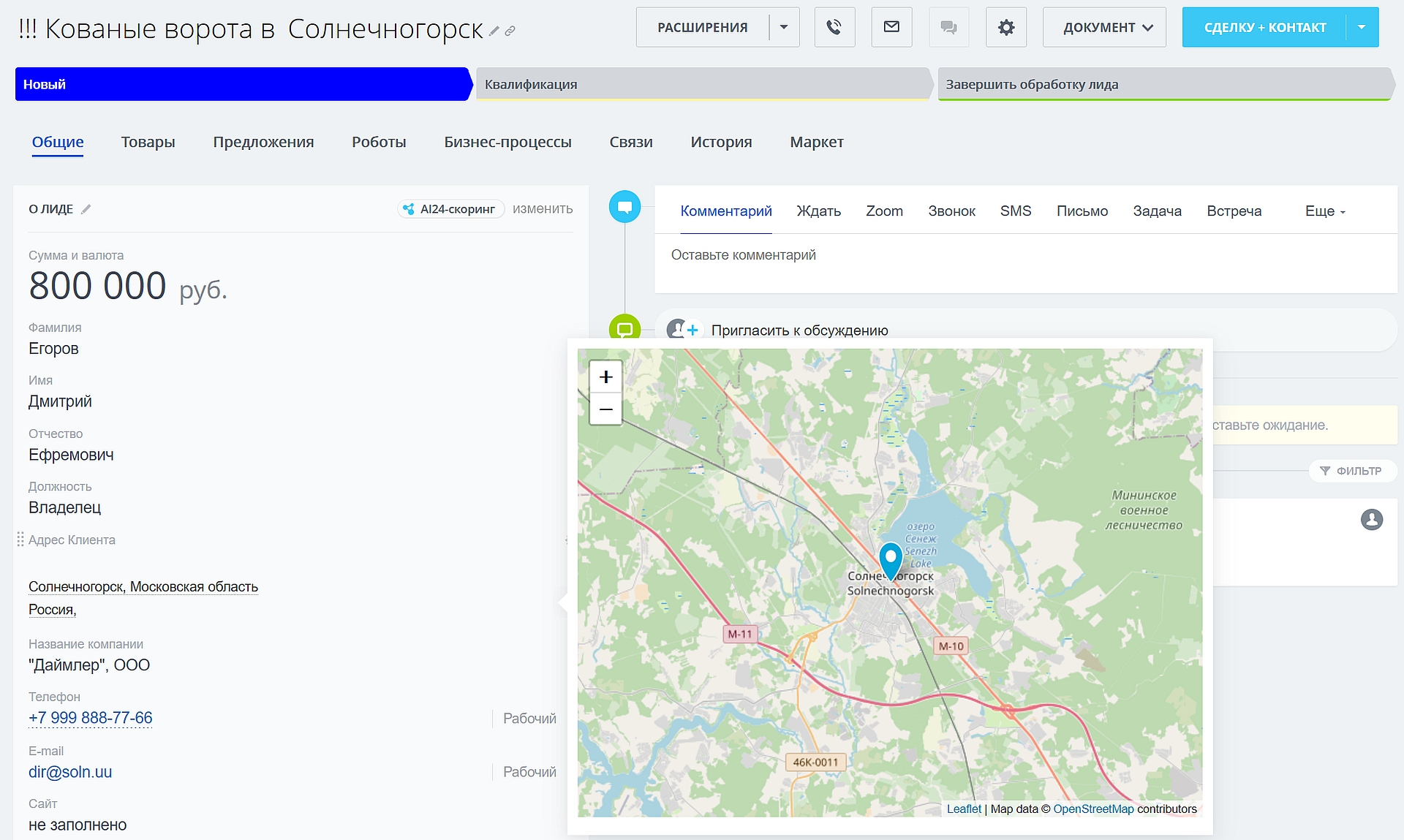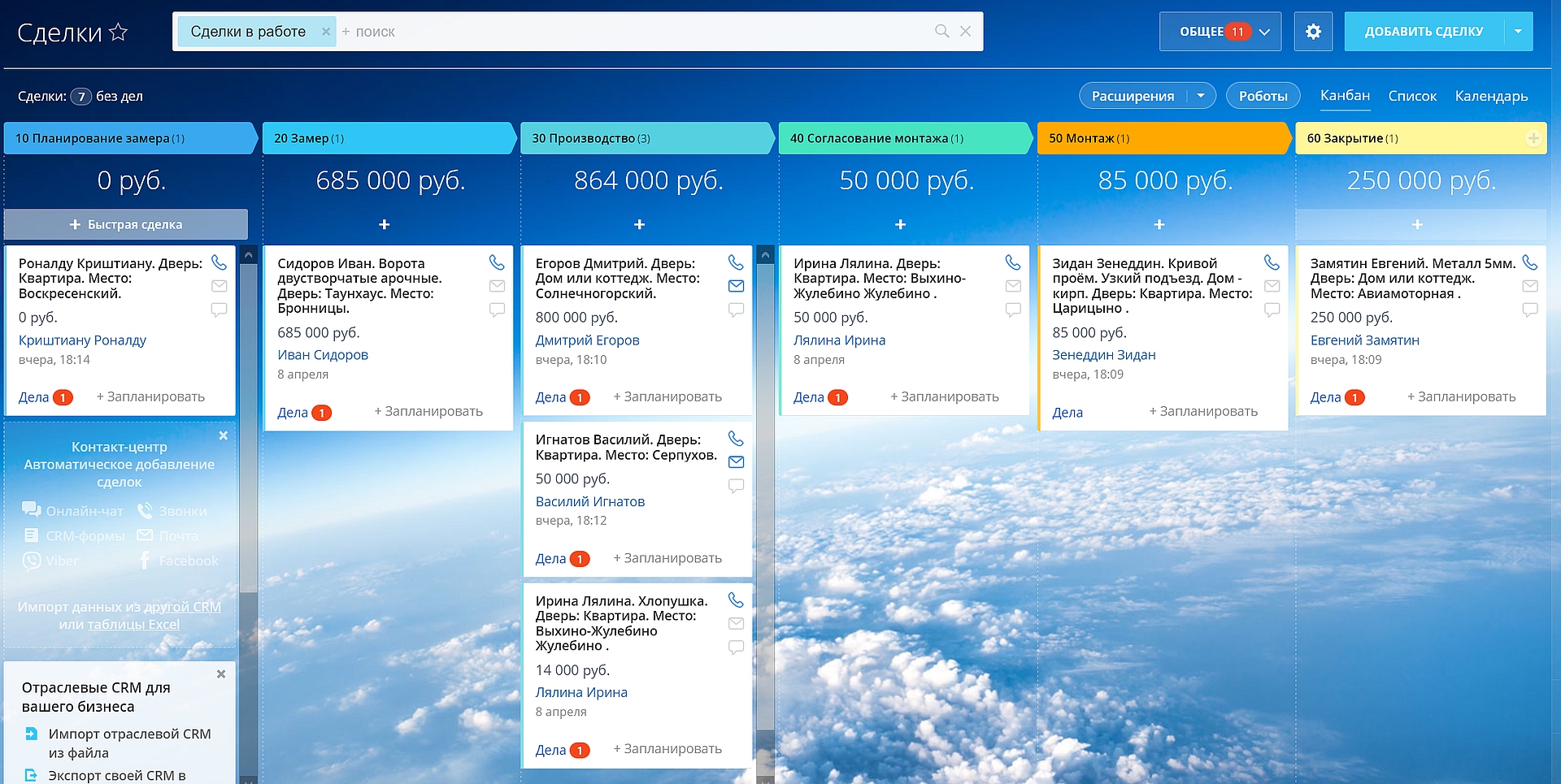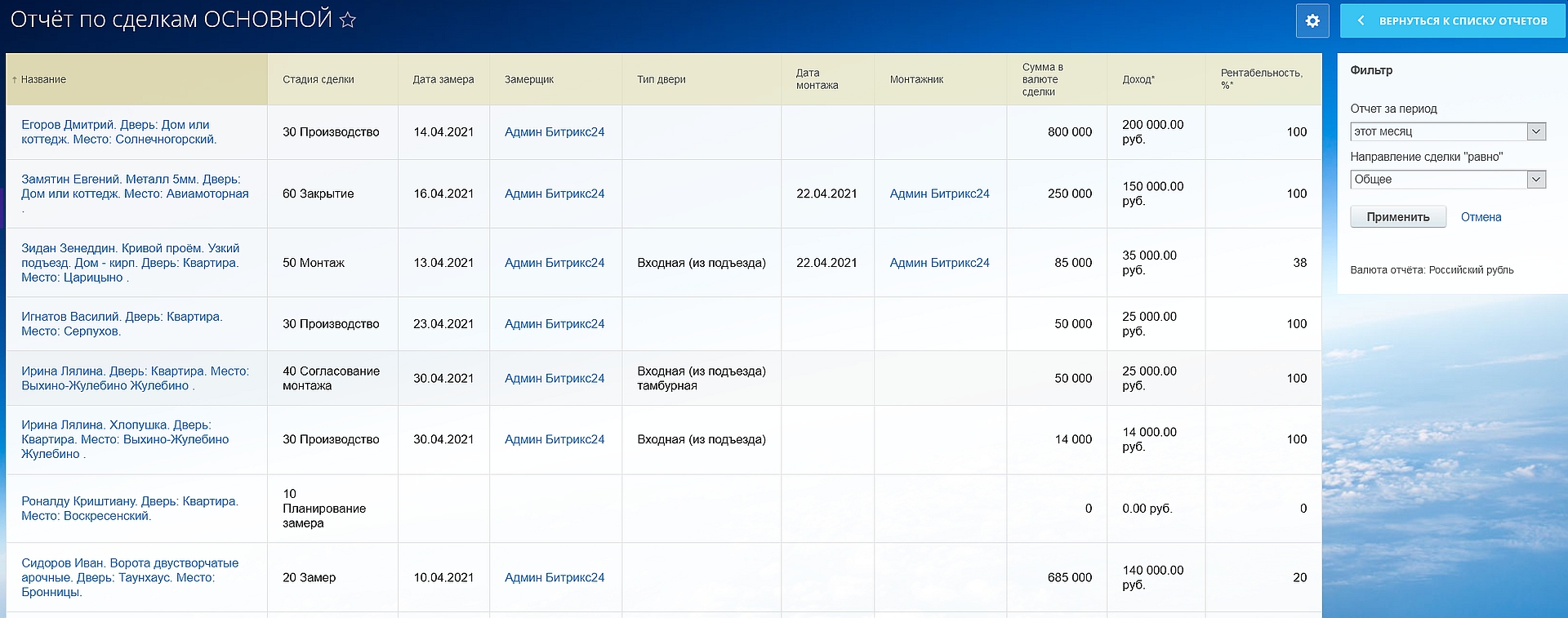 Настроенная CRM для компаний, кто устанавливает входные и межкомнатные двери. Подходит так же для смежных специализаций - ворот, ограждений, заборов и т.п. позаказных установок.