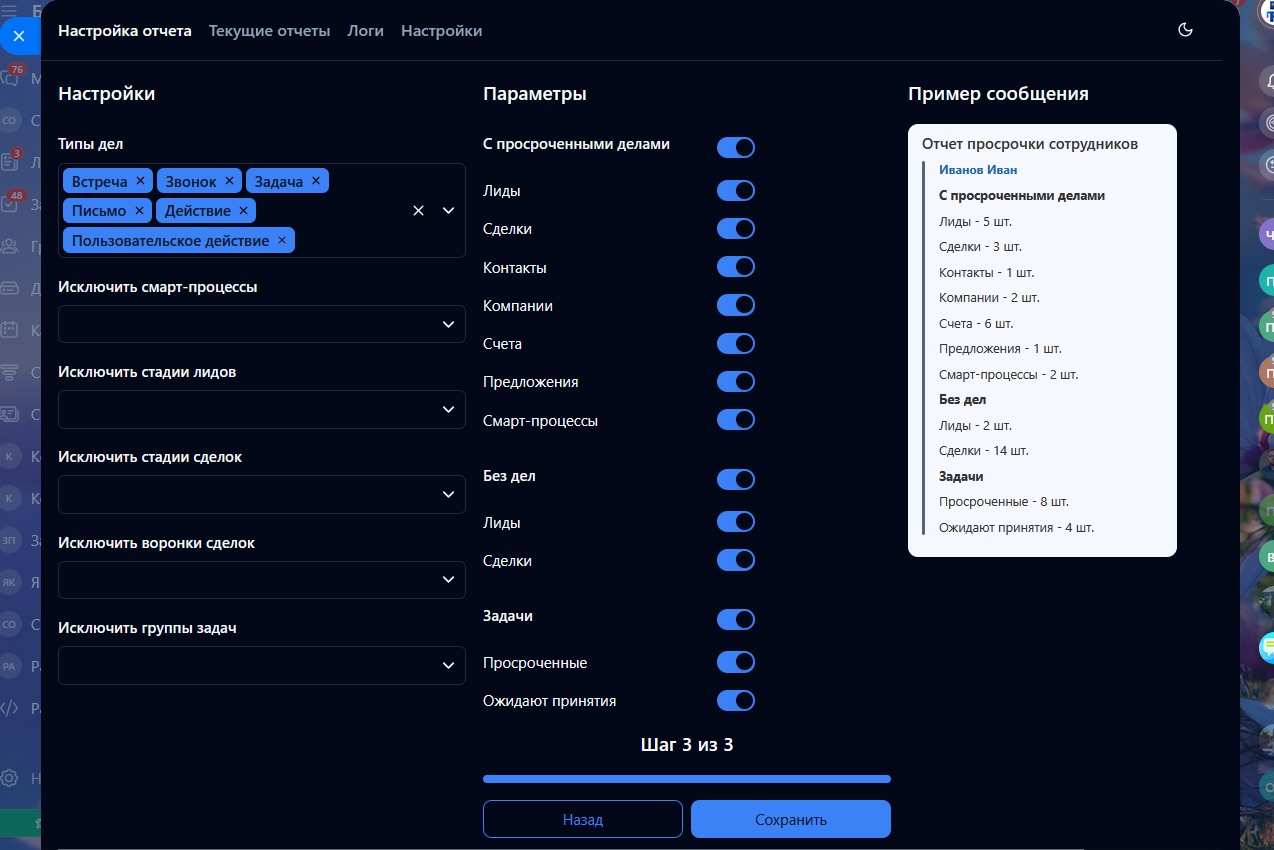 • Возможность включить/выключить в отчете следующие параметры: лиды, сделки, контакты, компании, счета, предложения, смарт-процессы (с просроченными делами); лиды, сделки (без дел); просроченные, ожидают принятия (задачи).
