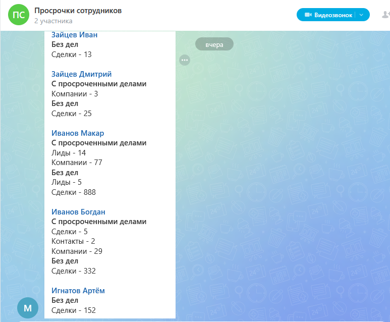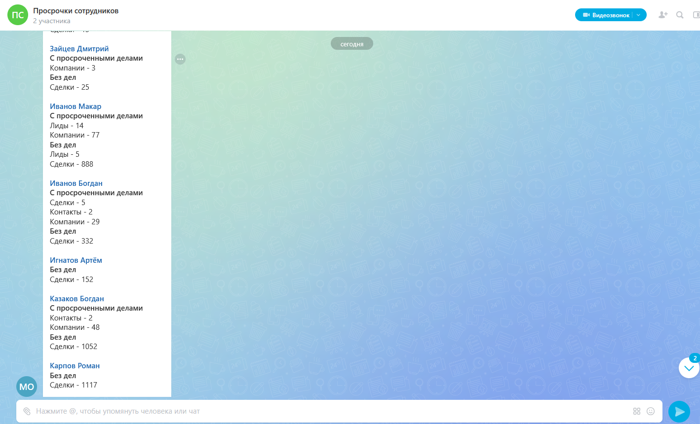 • Групповой чат - отправит чат-бот, чтобы все видели, в том числе сами сотрудники - так они будут знать, что их работа фиксируется;