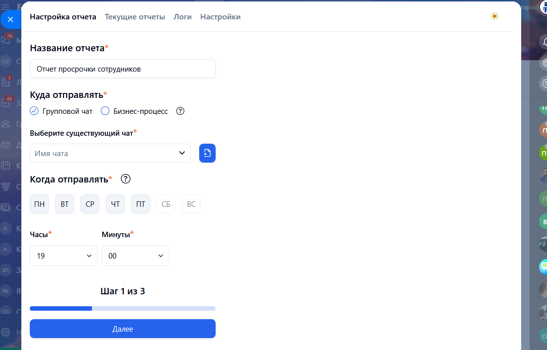 Выбирайте время и как отправлять отчёт (через чат или запускать бизнес-процесс).