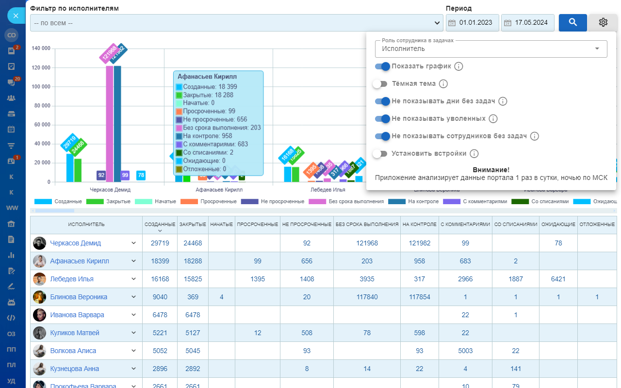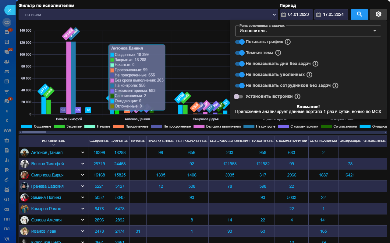 - При первой загрузке анализирует все задачи за весь период (тесты показали скорость ~10 000 задач в минуту);