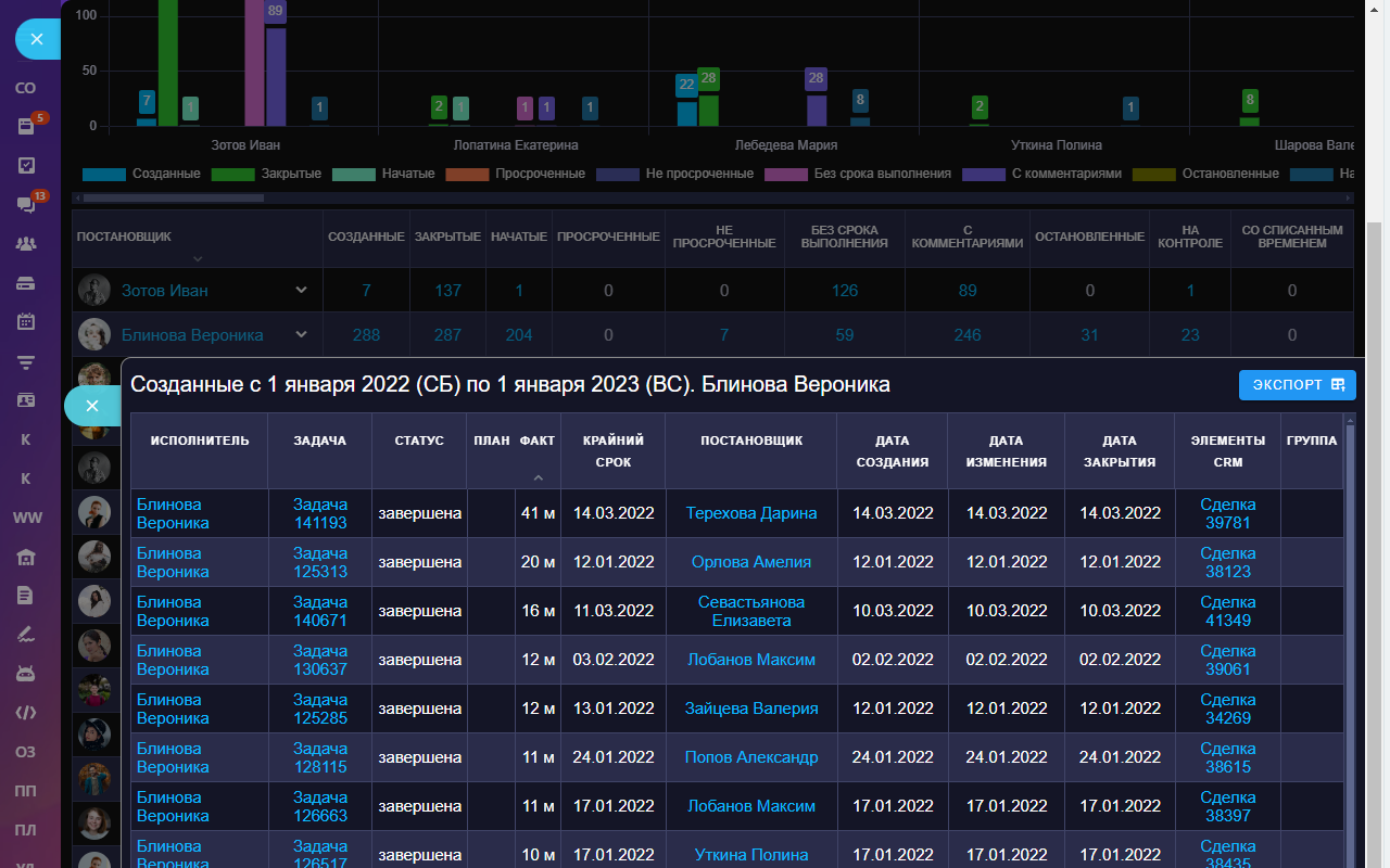 - Есть экспорт результатов (количество задач) и экспорт детализации задач.