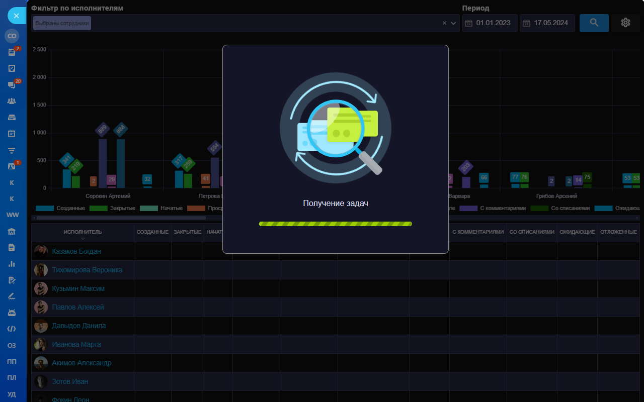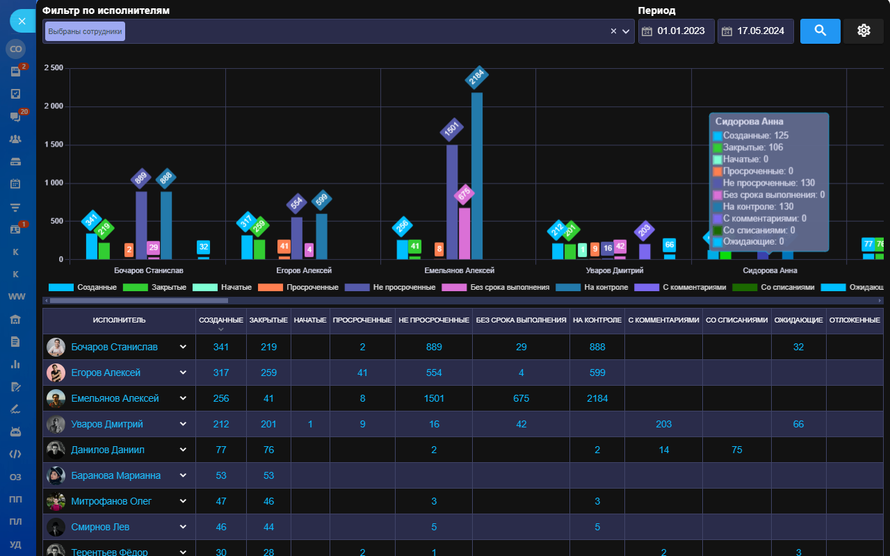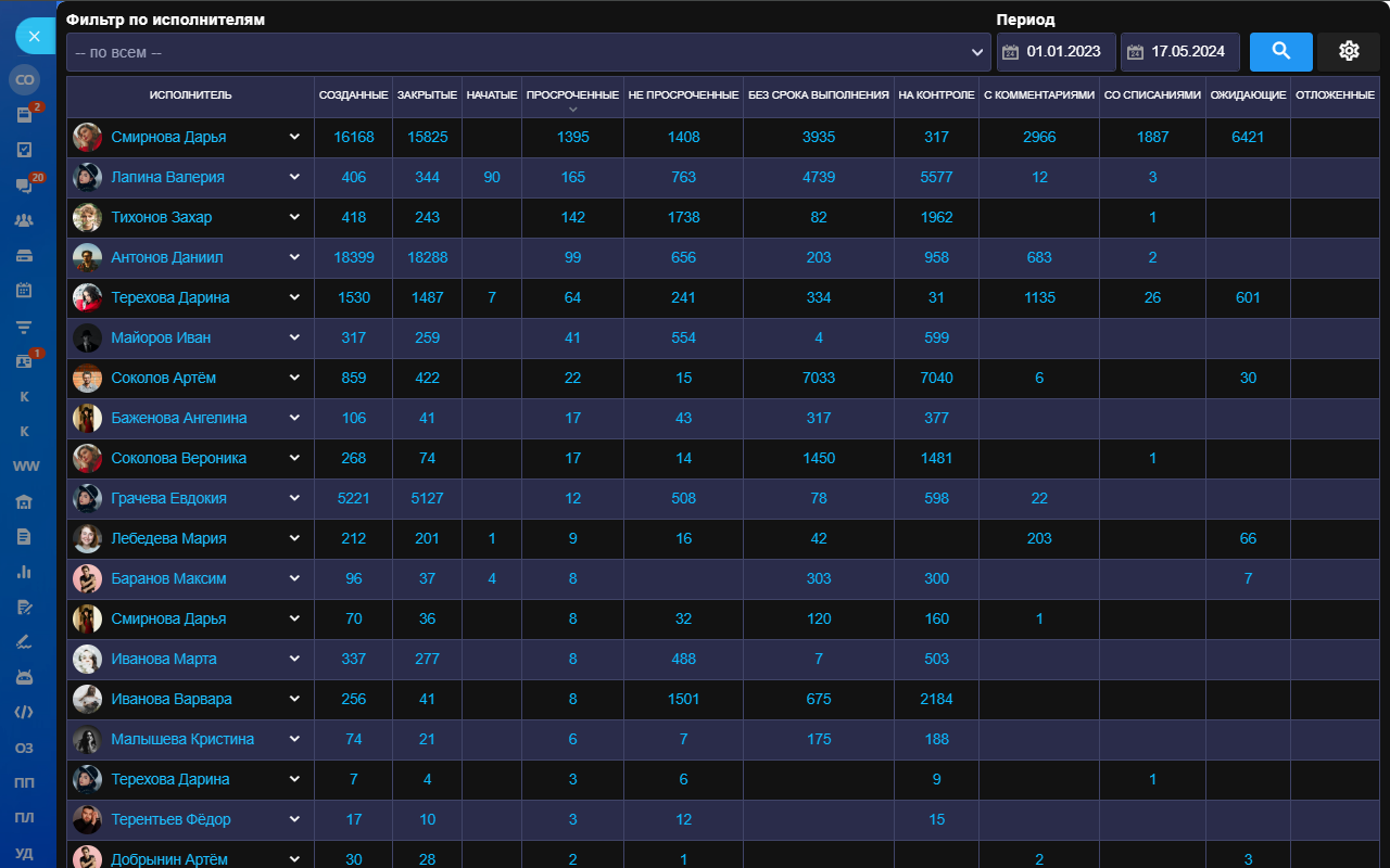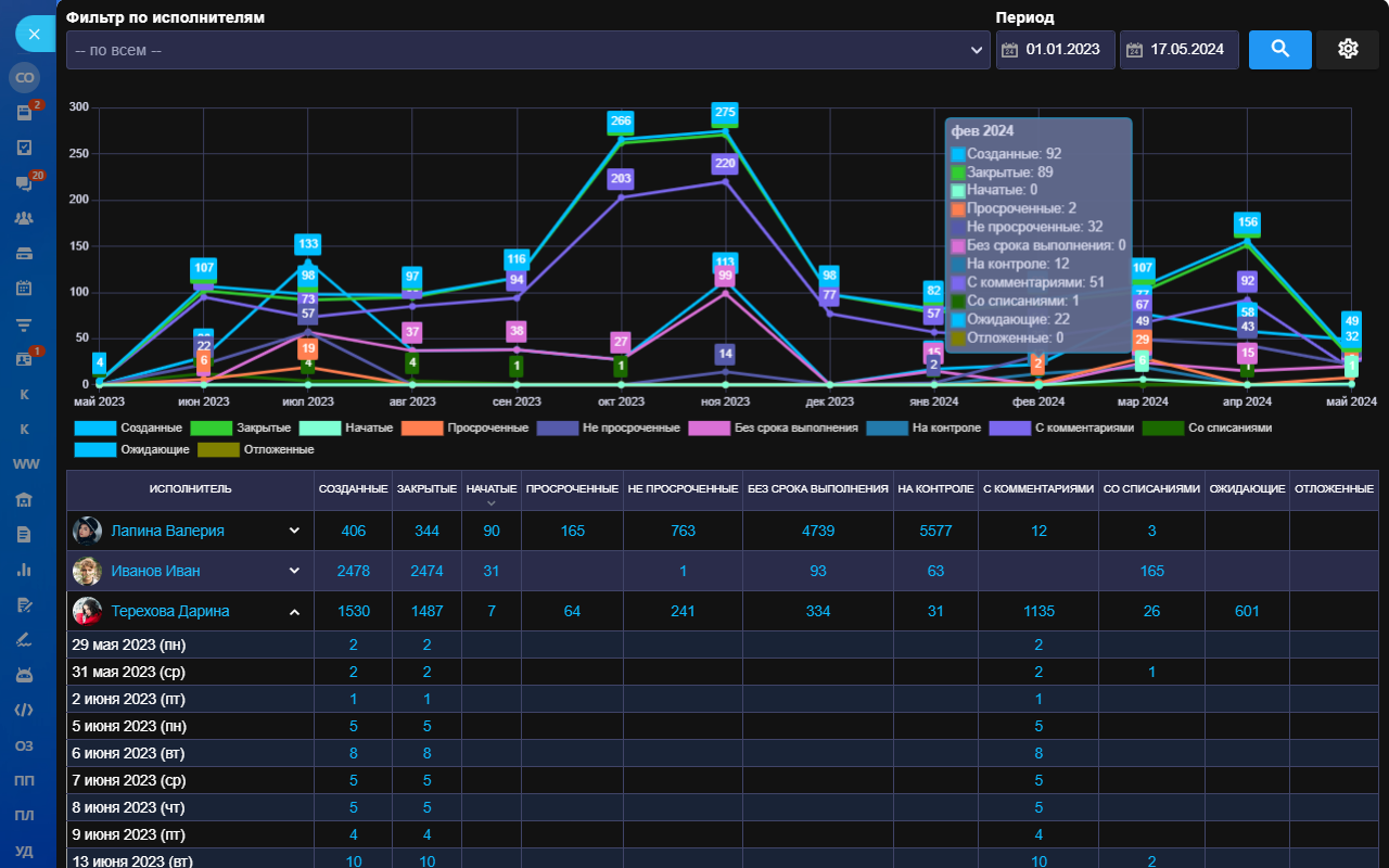 - Посмотреть динамику количества просрочек задач по исполнителю;