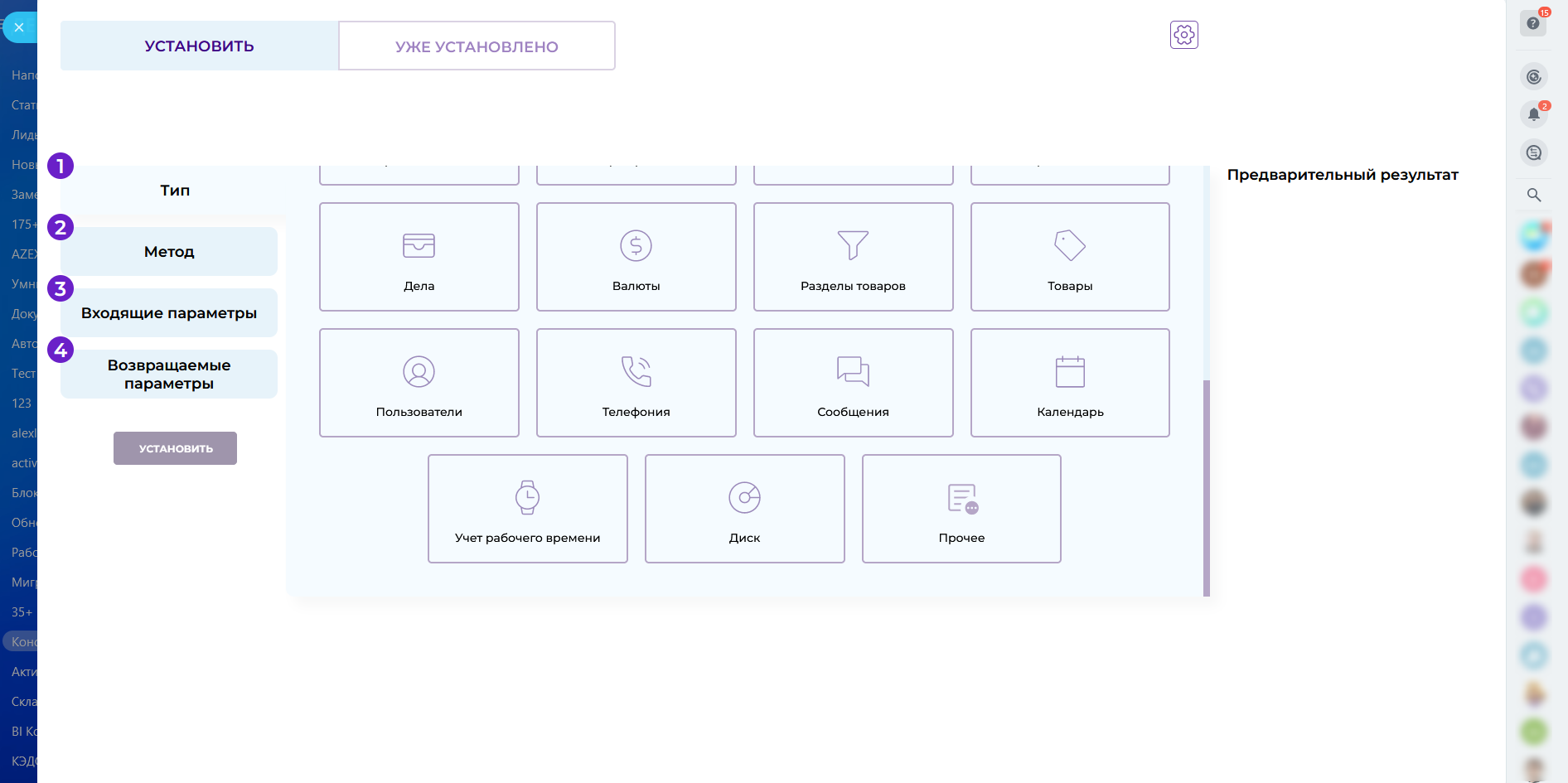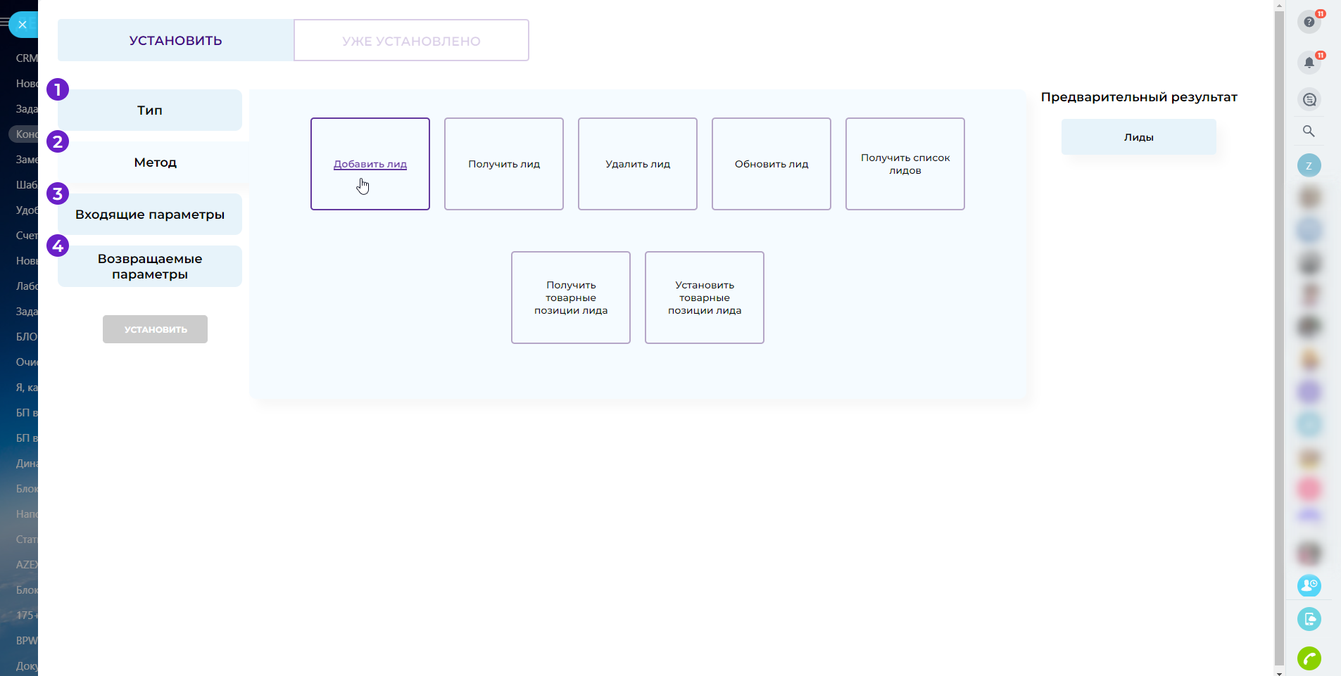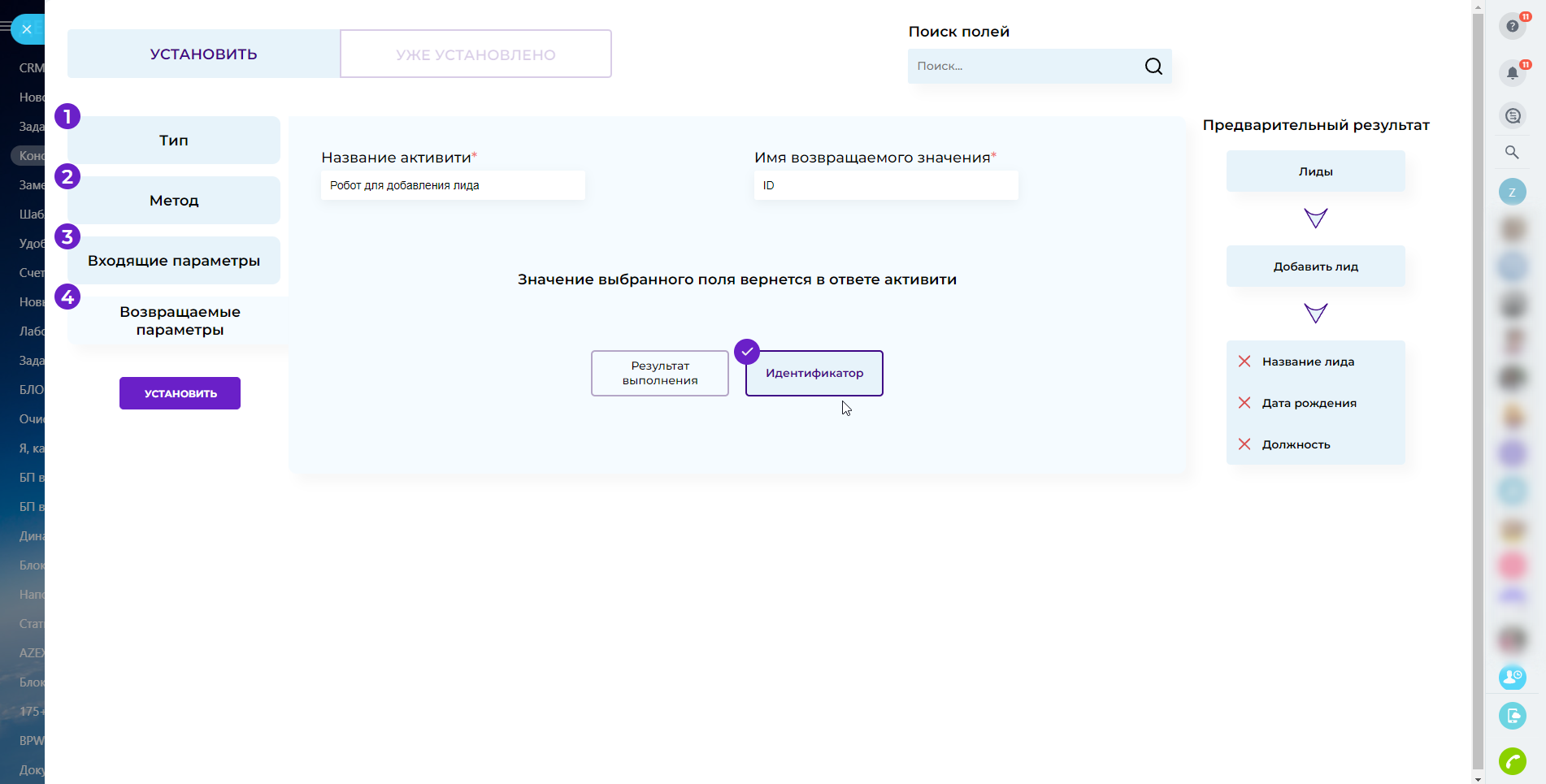 - Выберите сущность (лид, сделка, контакт и т.п.);