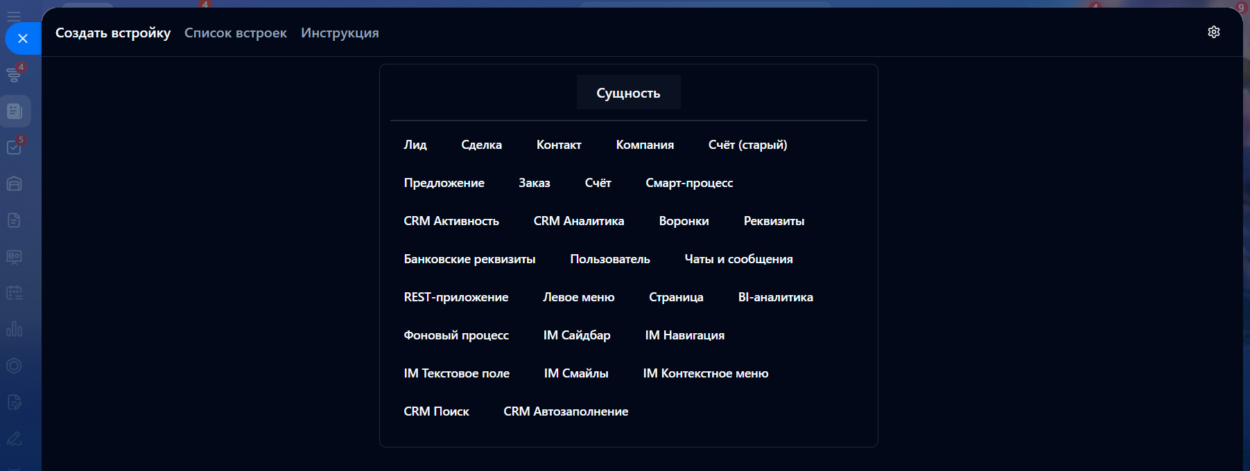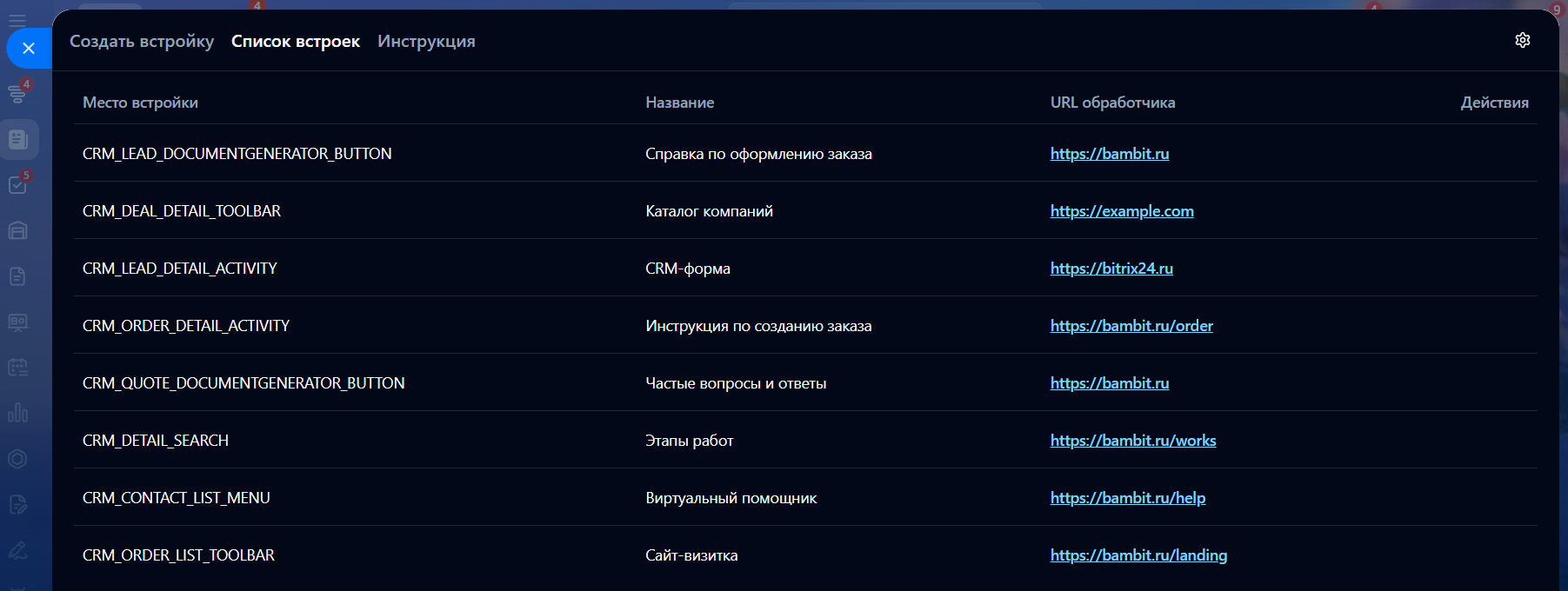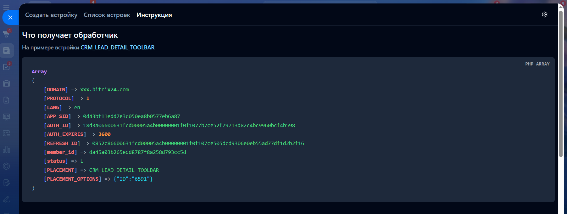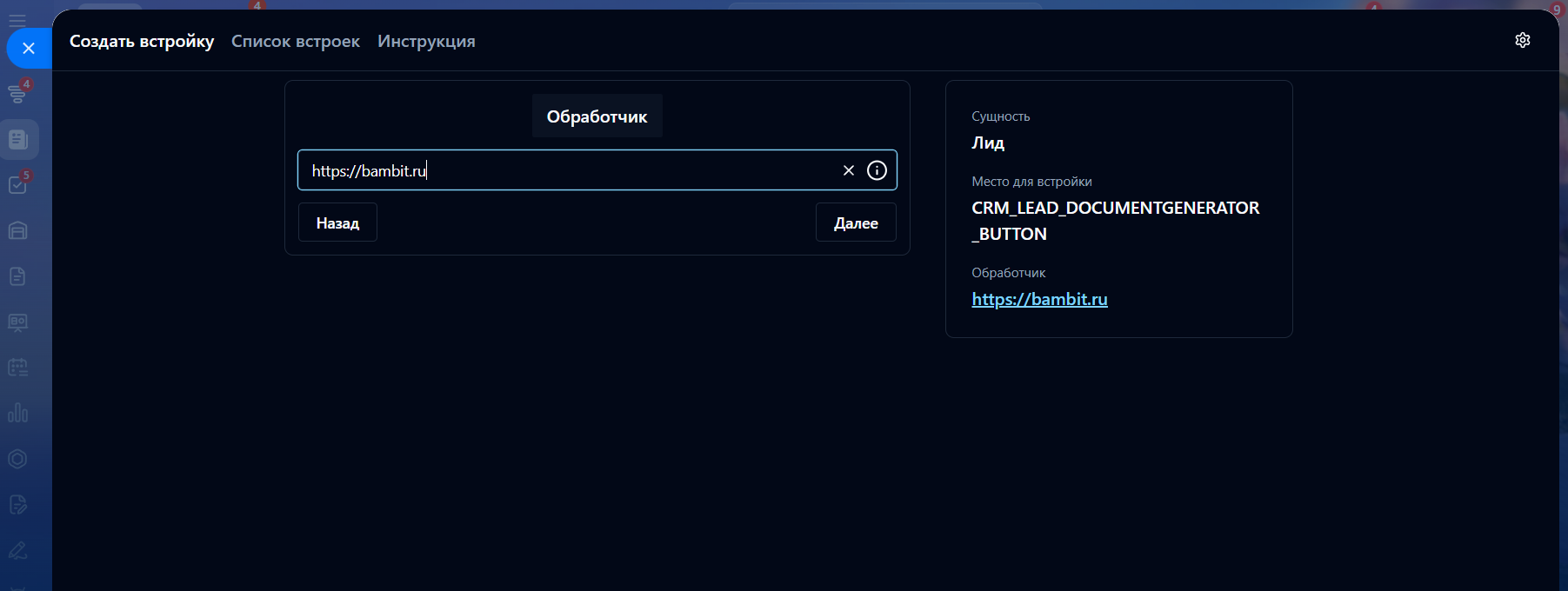 • Интеграция с внешним сервисом, куда будут переданы параметры, например, ID текущий сделки.