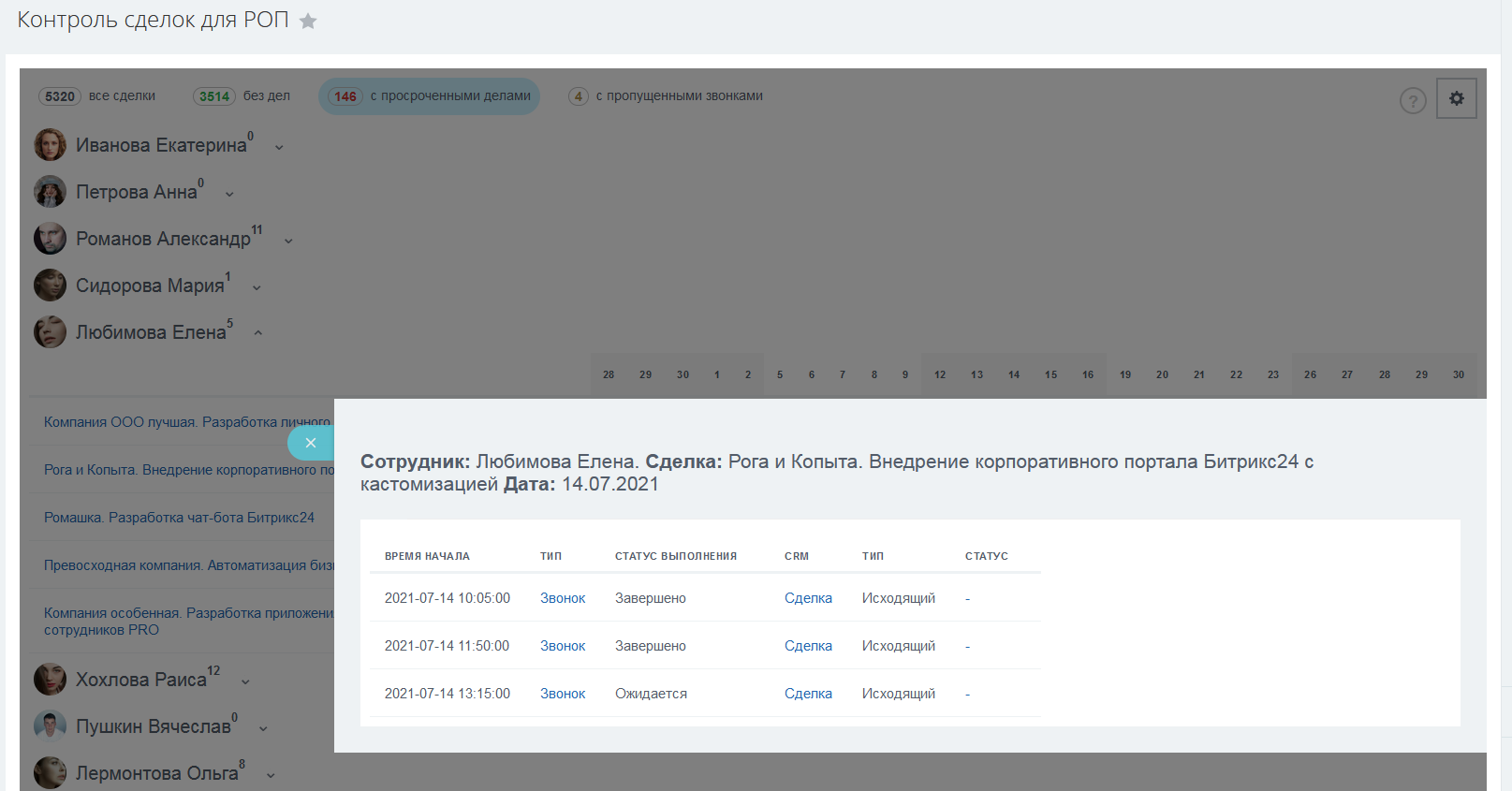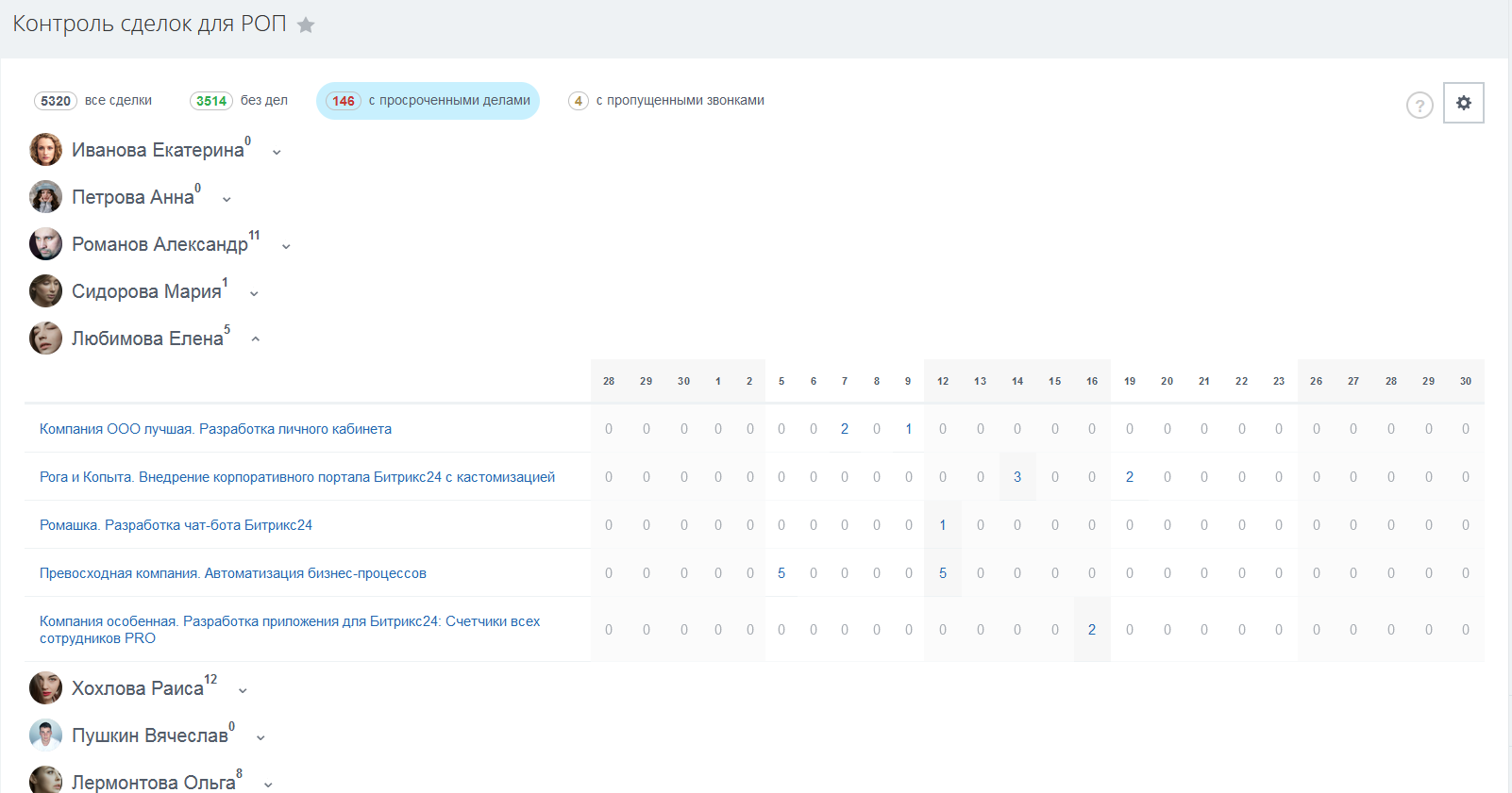 - Увидеть сделки (в работе) в разрезе по сотрудникам;