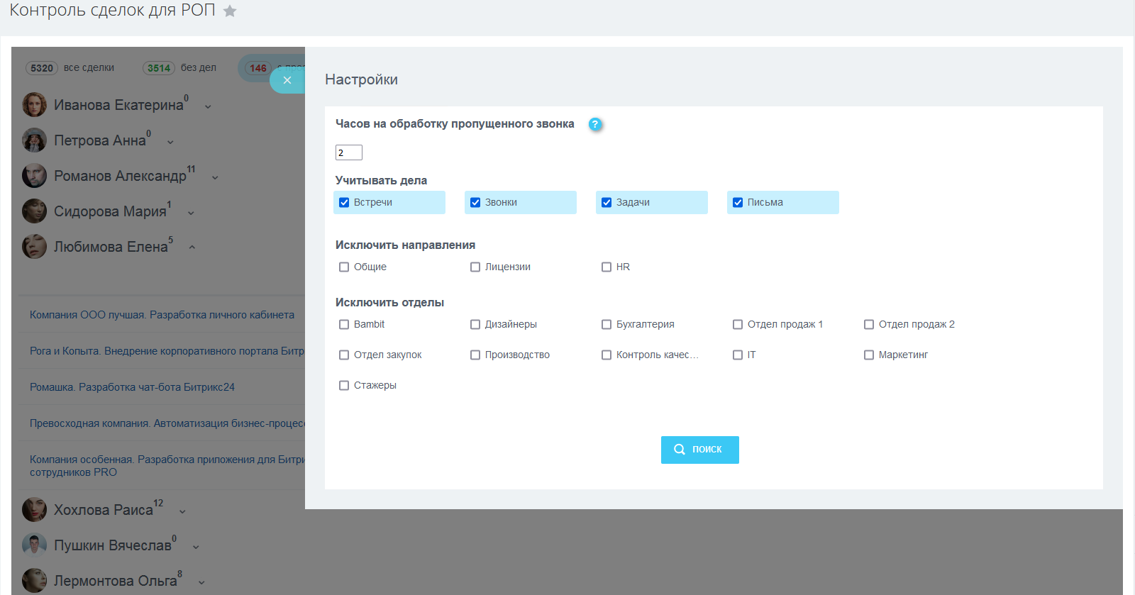 - Доступны счетчики: сделки без дел или сделки с просроченными делами.