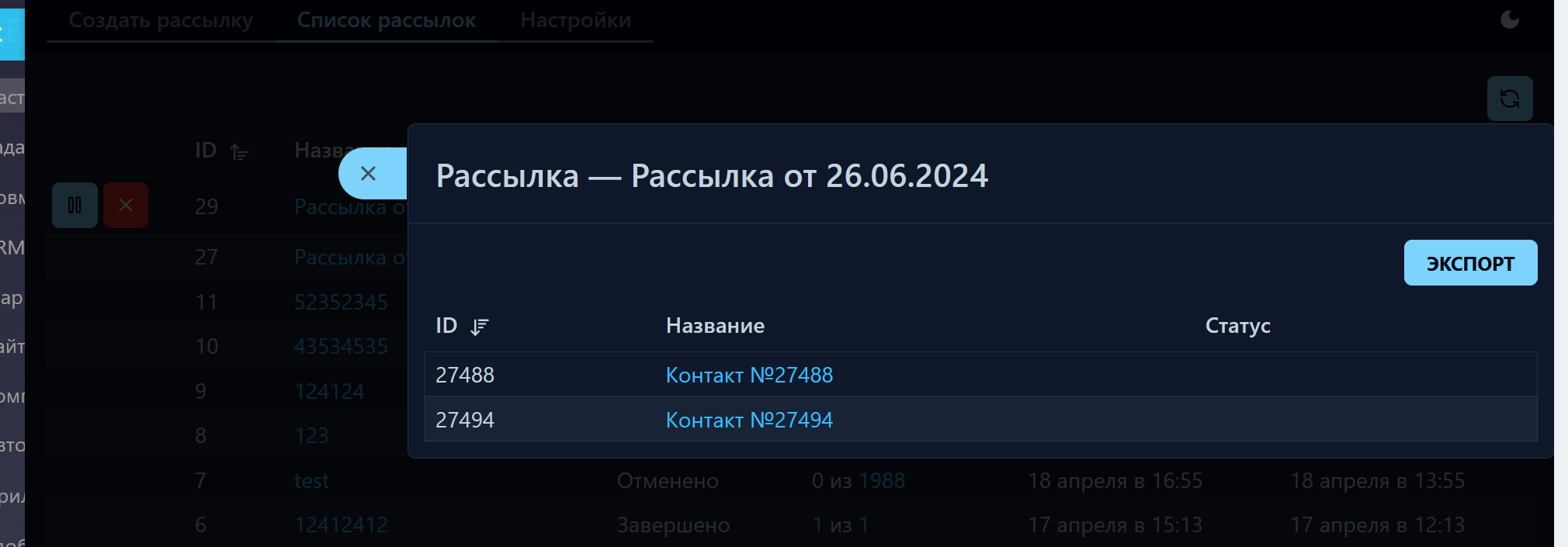 - Выгрузить сущности со стадиями (лиды/сделки/смарт-процессы) в XLS и посмотреть, в каких стадиях они находятся после рассылки. Например, рассылка отправлена по забытым сделкам, по итогу у вас будет список успешных сделок по этой рассылке;