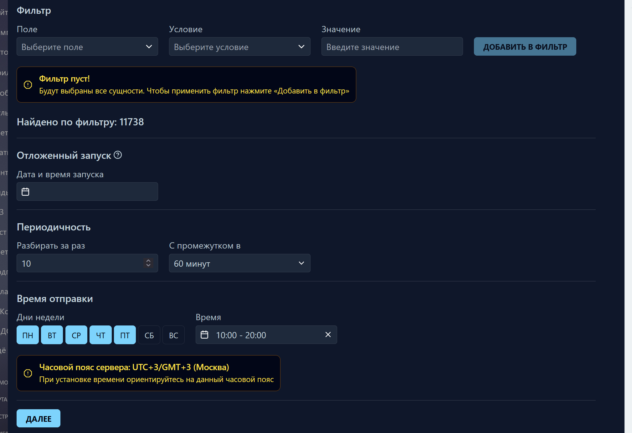 - Создавать лиды для сотрудников по клиентской базе для обзвона. Например, запуск к компаниям по фильтру, по 10 бизнес-процессов в час, с созданием сделки в определенной воронке на ответственного (поочередно).