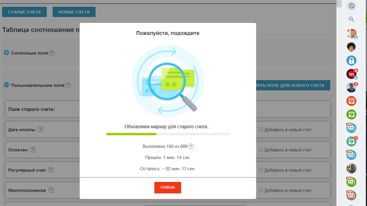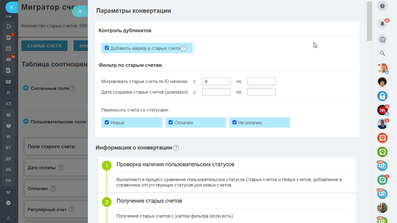 - Проверьте перенос (конвертацию) на одном старом счете, указав 1 ID. Проверьте, какие поля не перенеслись, удалите новый счет, повторите перенос счетов с настройкой сопоставления полей;