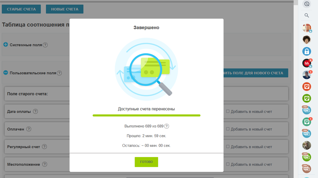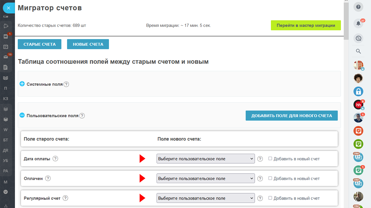 - Сделайте сопоставление полей между старым и новым счетом (при необходимости создайте поле в новом счете);