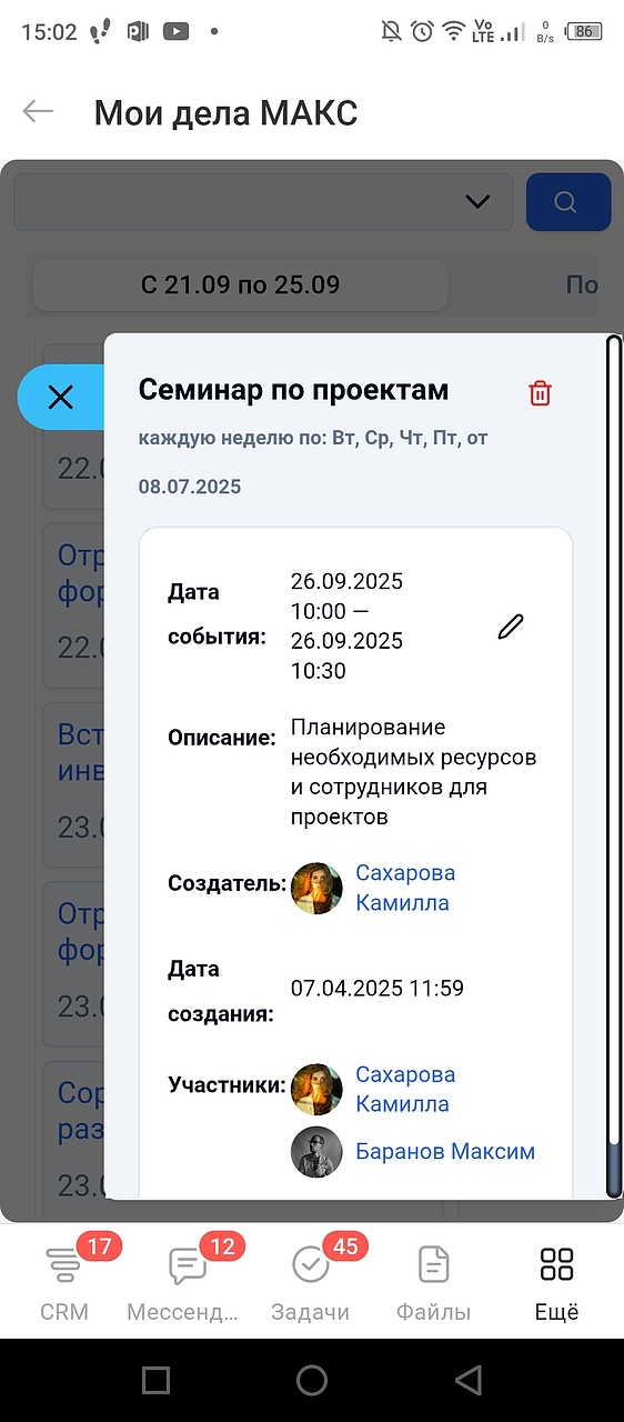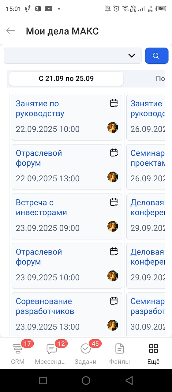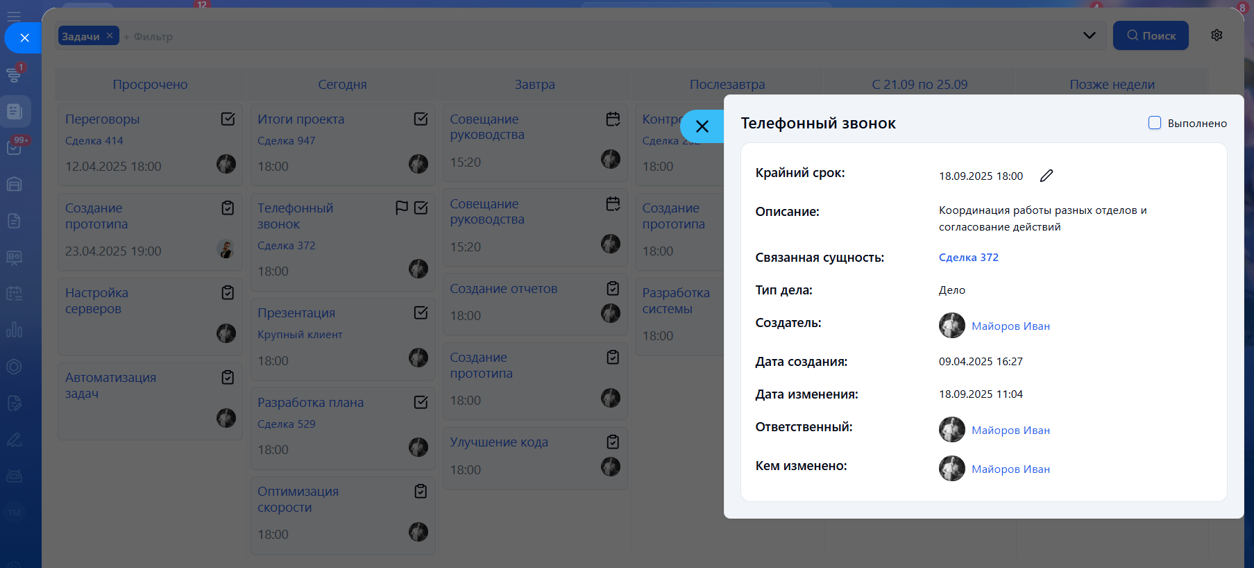 • Менять стадии (изменять сроки дел и задач, время событий в календаре);
