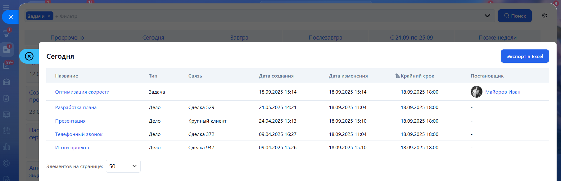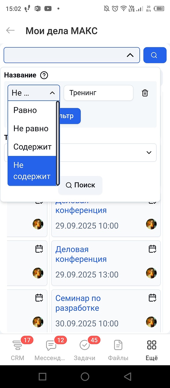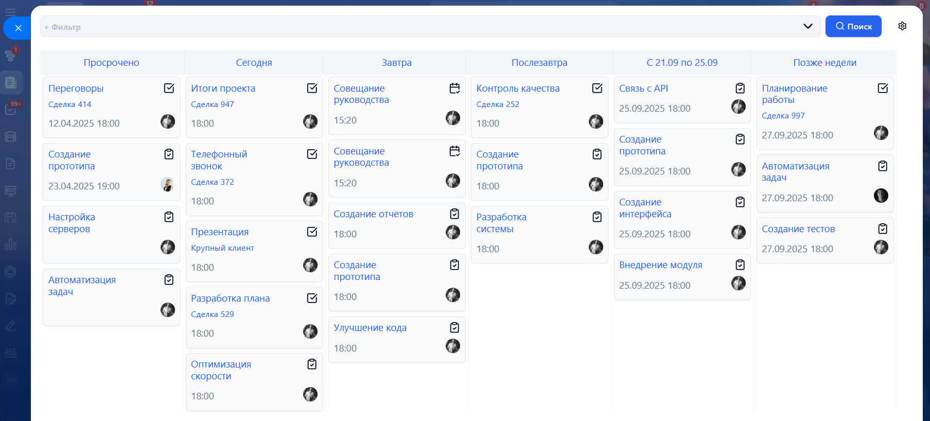 • Просрочено - сюда попадают просроченные задачи и дела;
