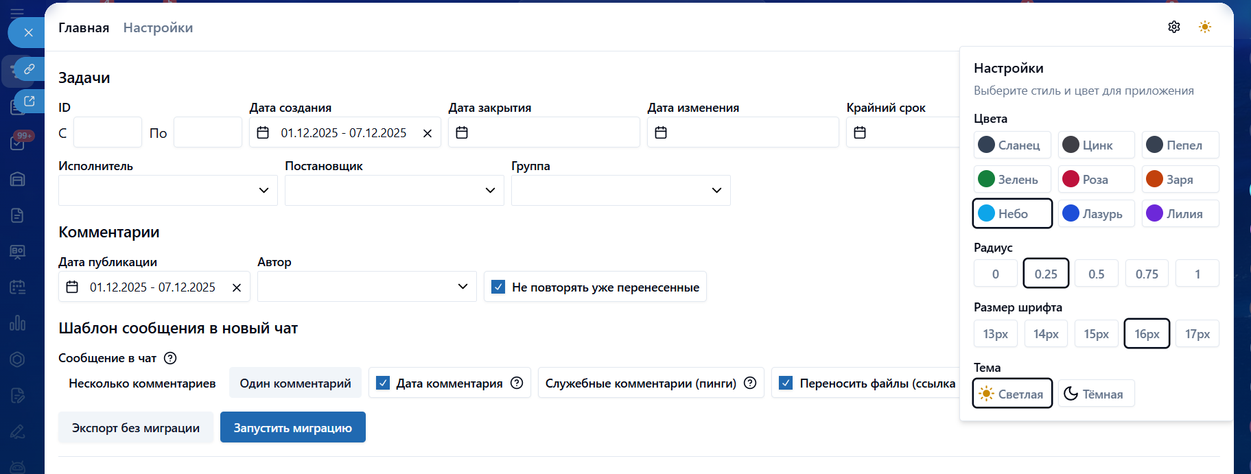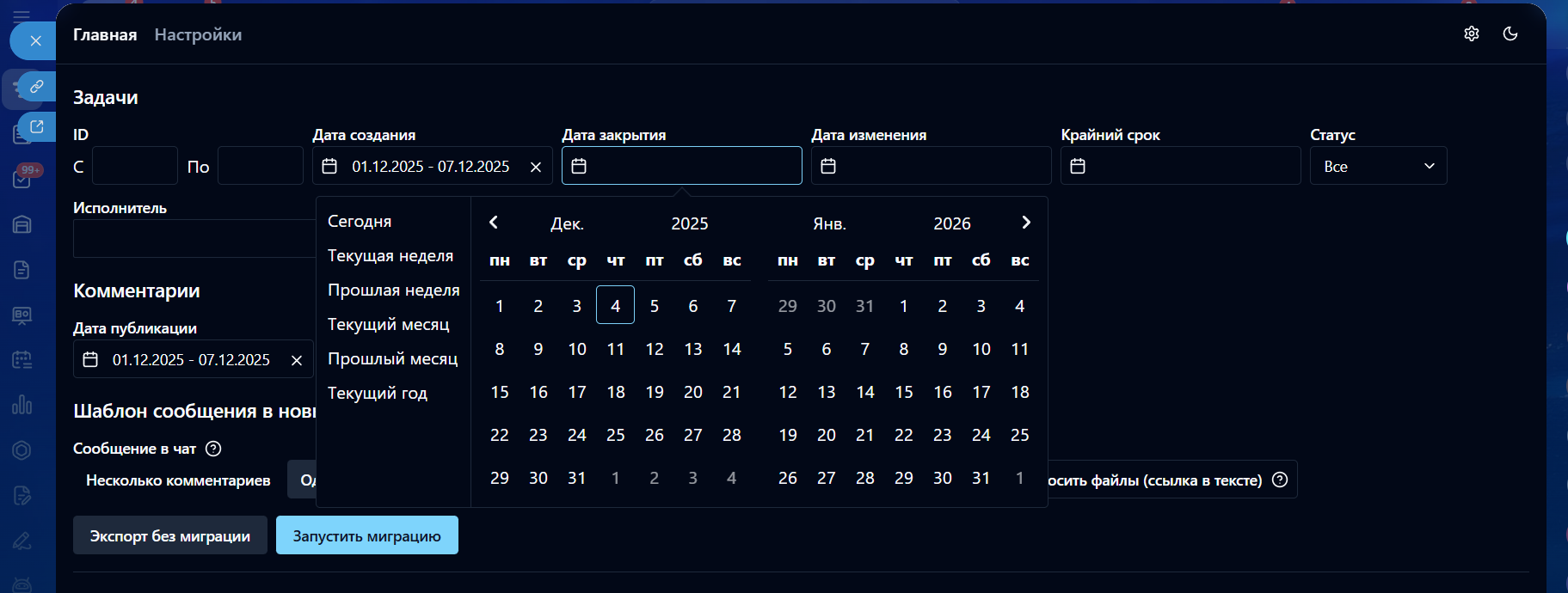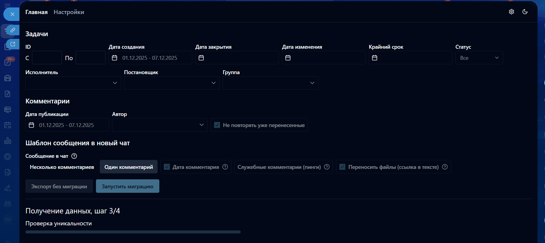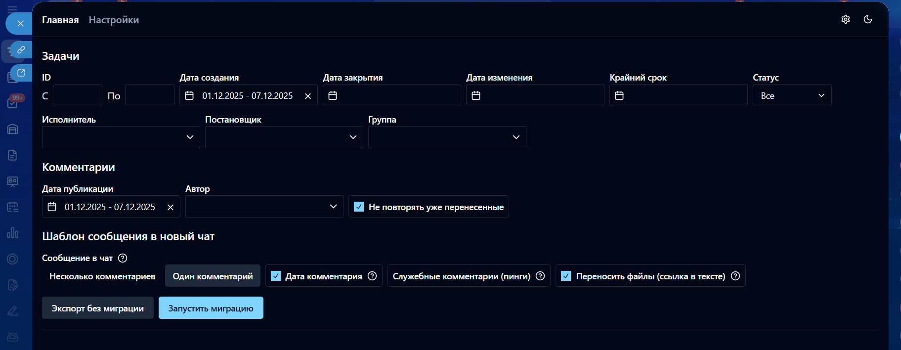 • Запуск миграции (переноса) старых комментариев в новые чаты задач по шаблону;