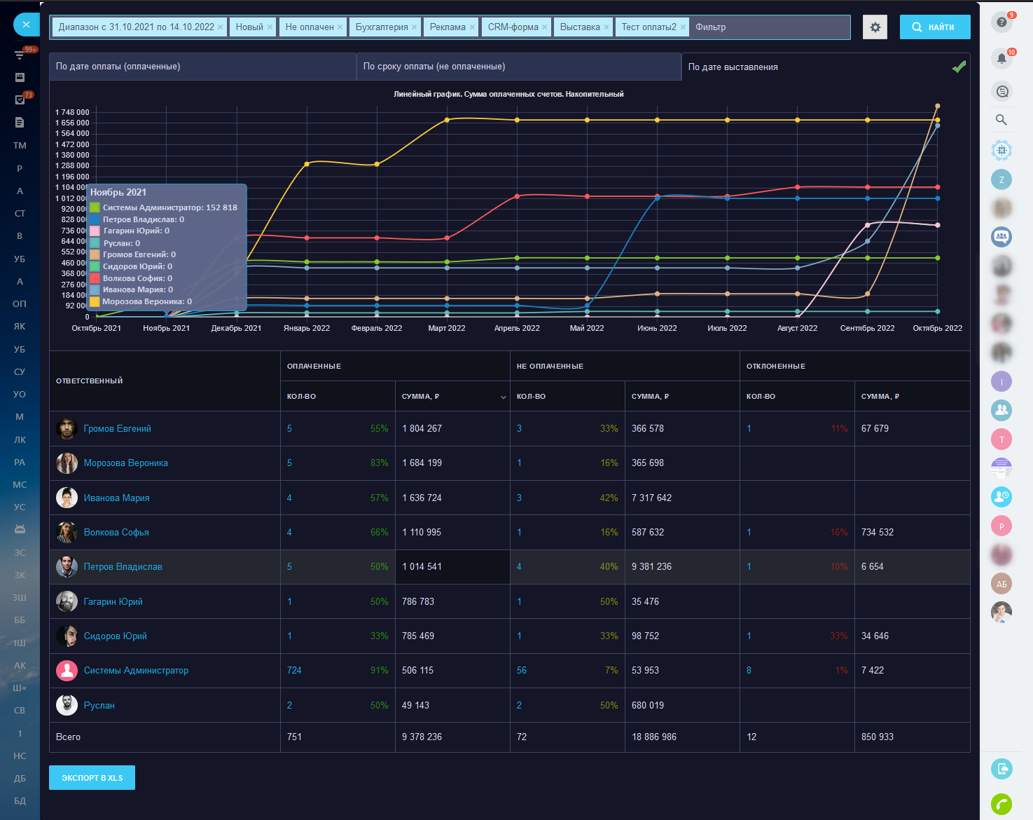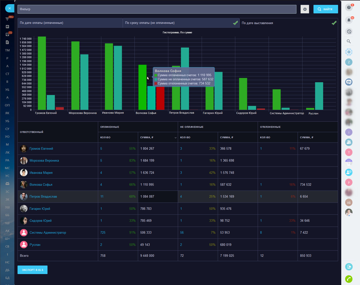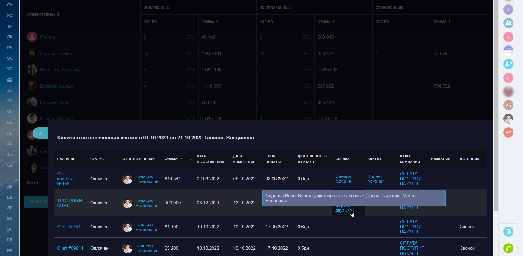 - Возможность просмотра счетов по ответственным лицам, стадиям и итогам;