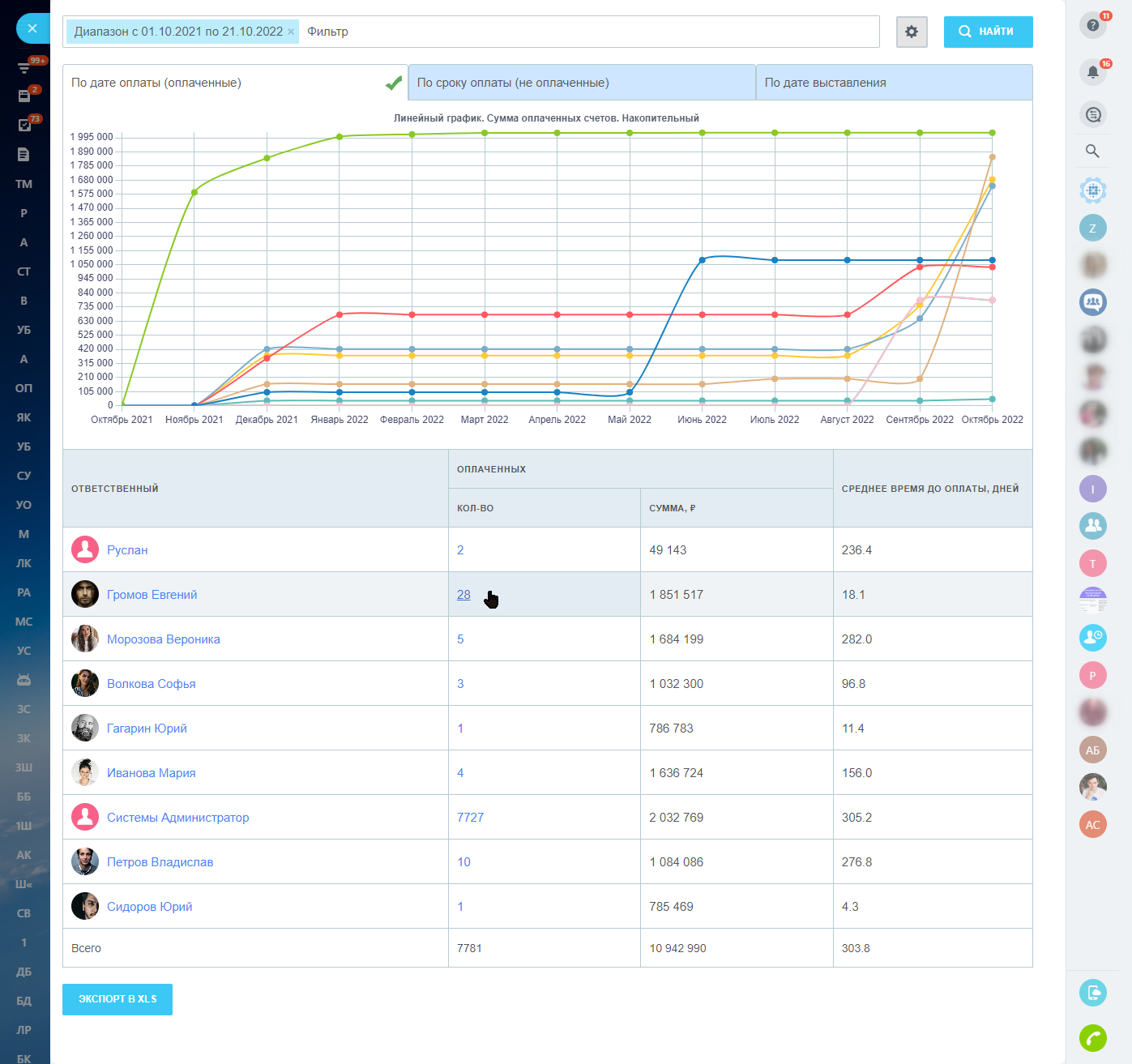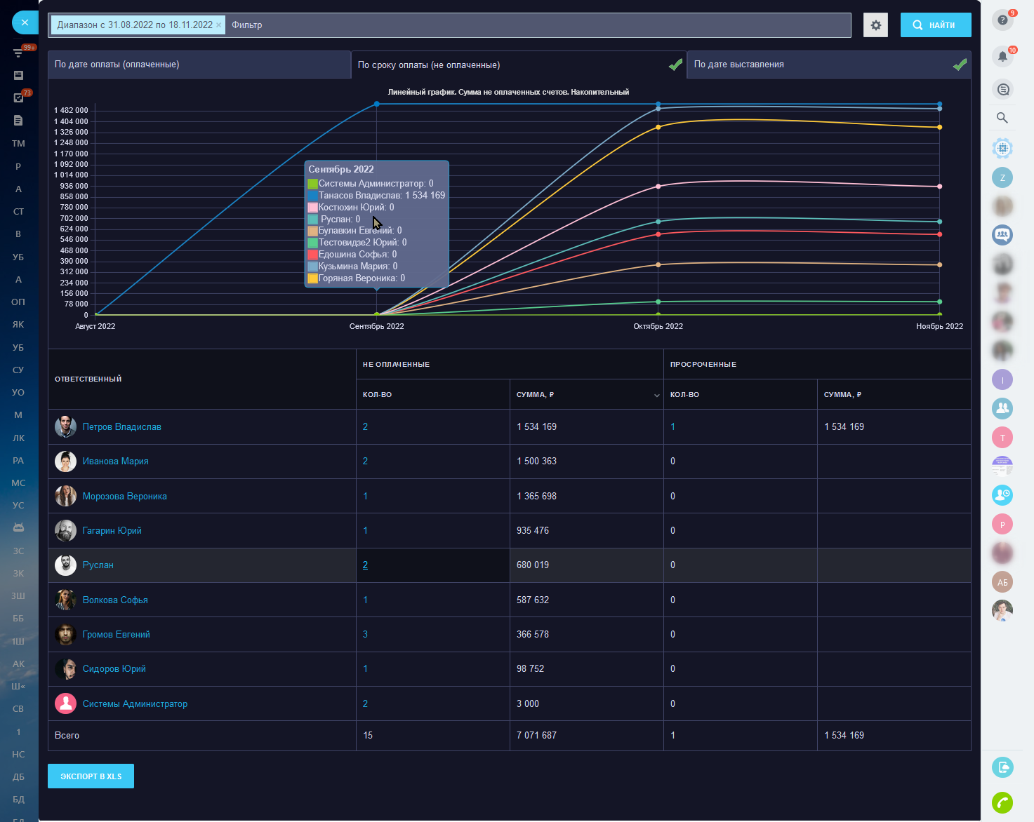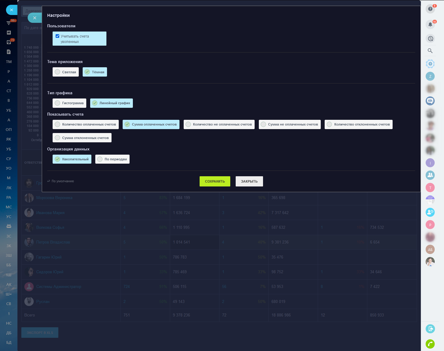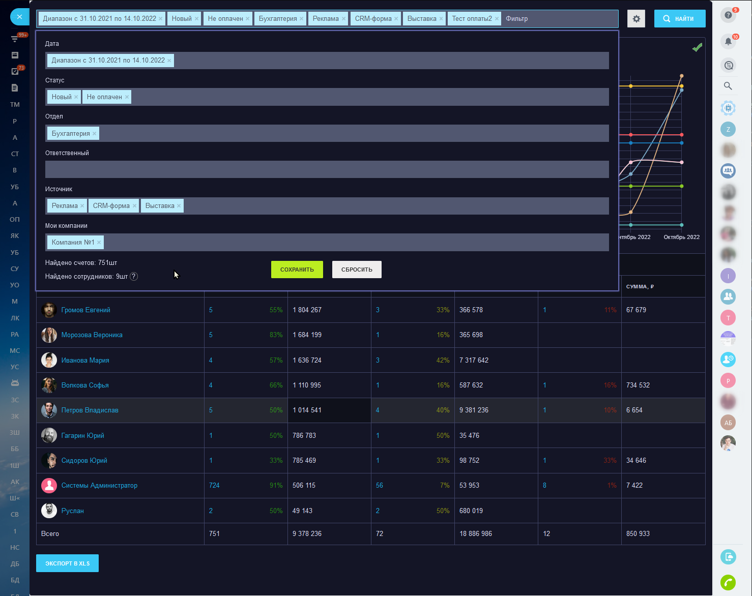 - Возможность просмотра счетов по ответственным лицам, стадиям и итогам;