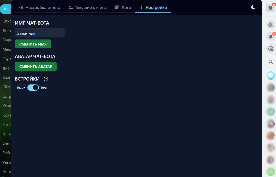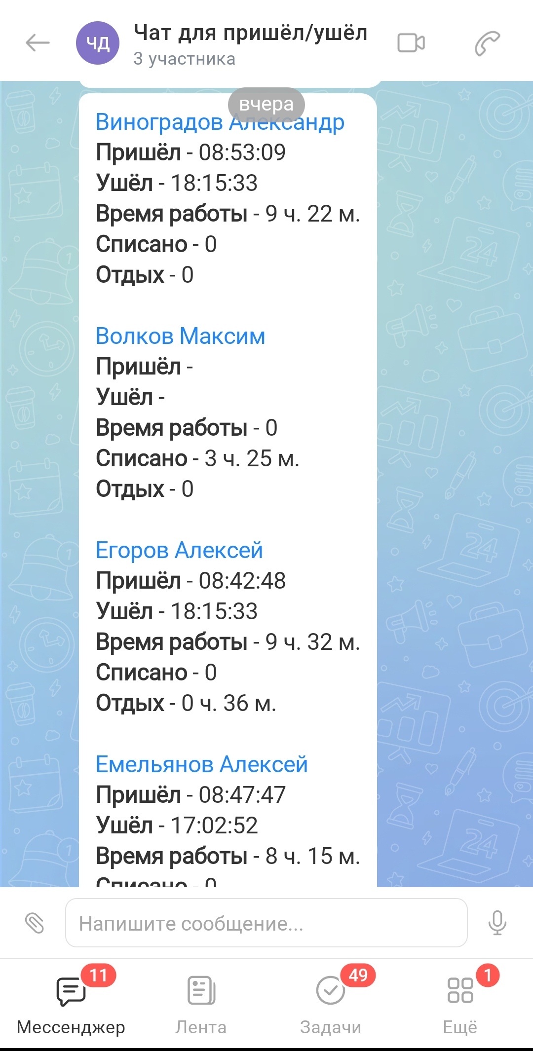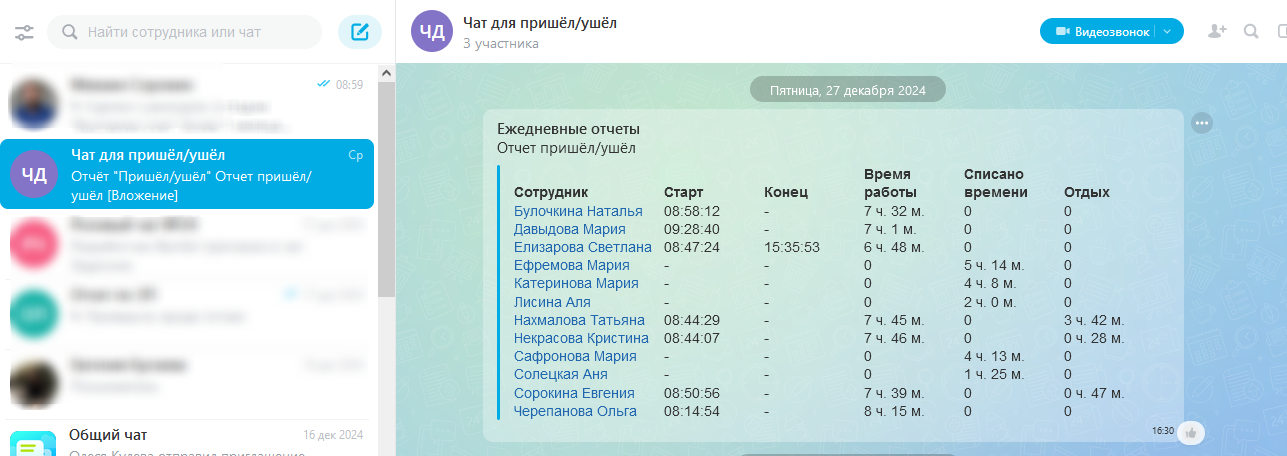 - Групповой чат, чтобы все видели, в том числе сами сотрудники - так они будут знать, что их работа фиксируется;
