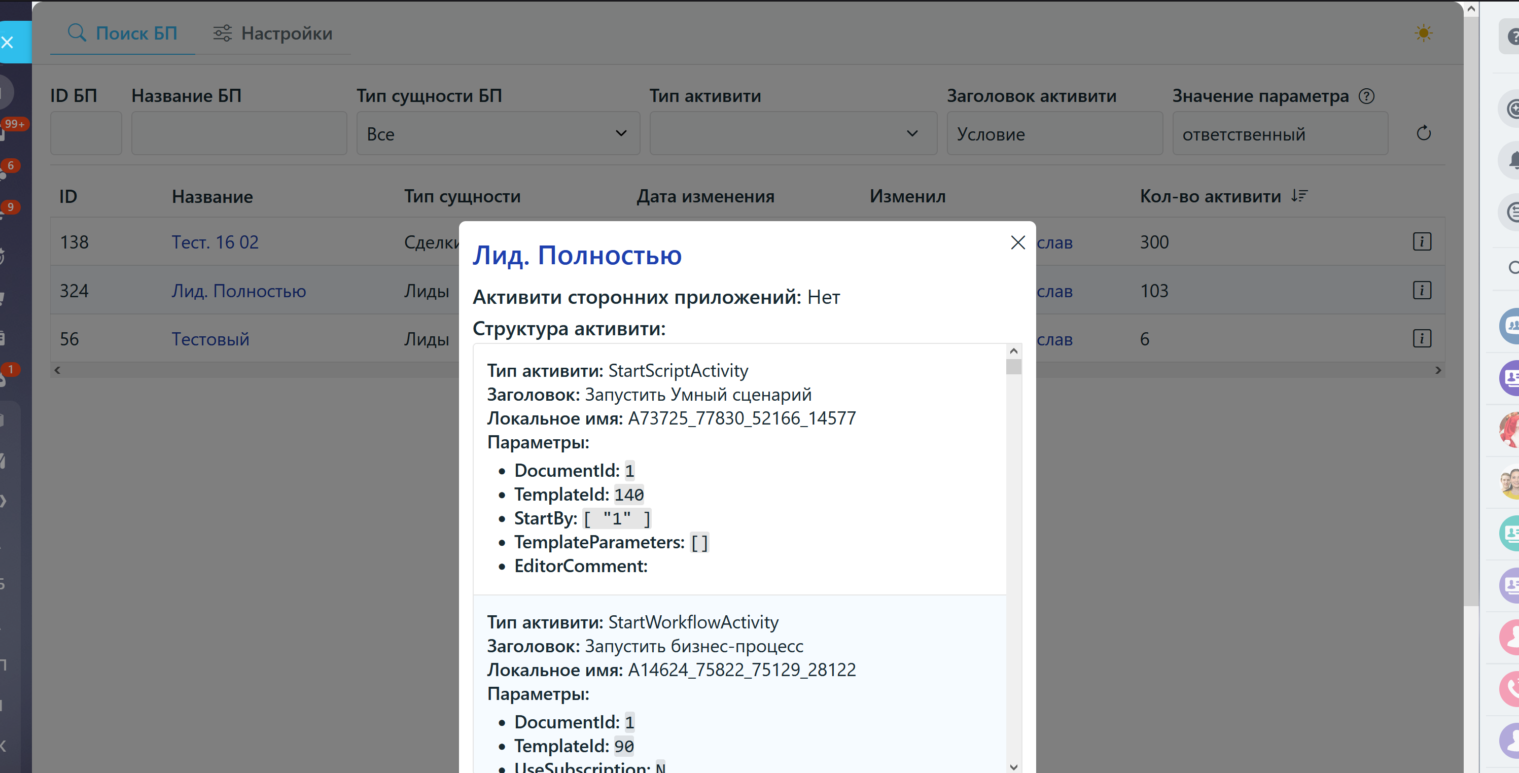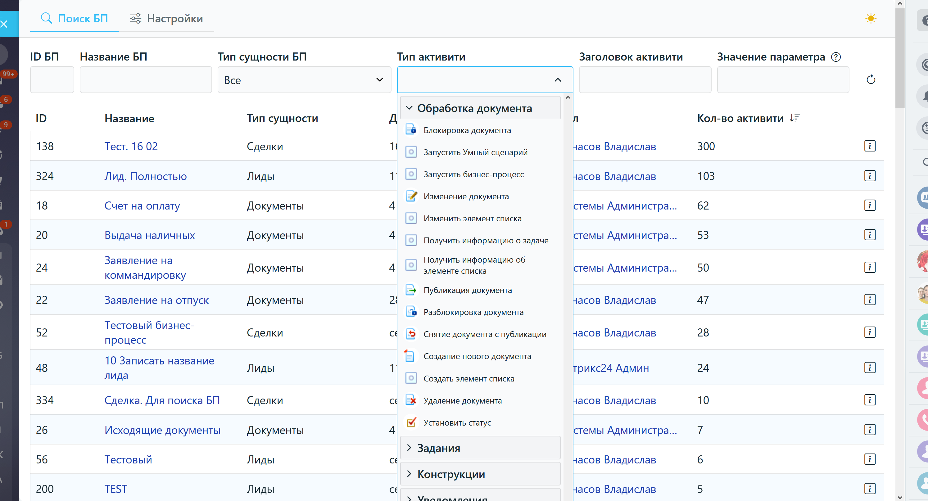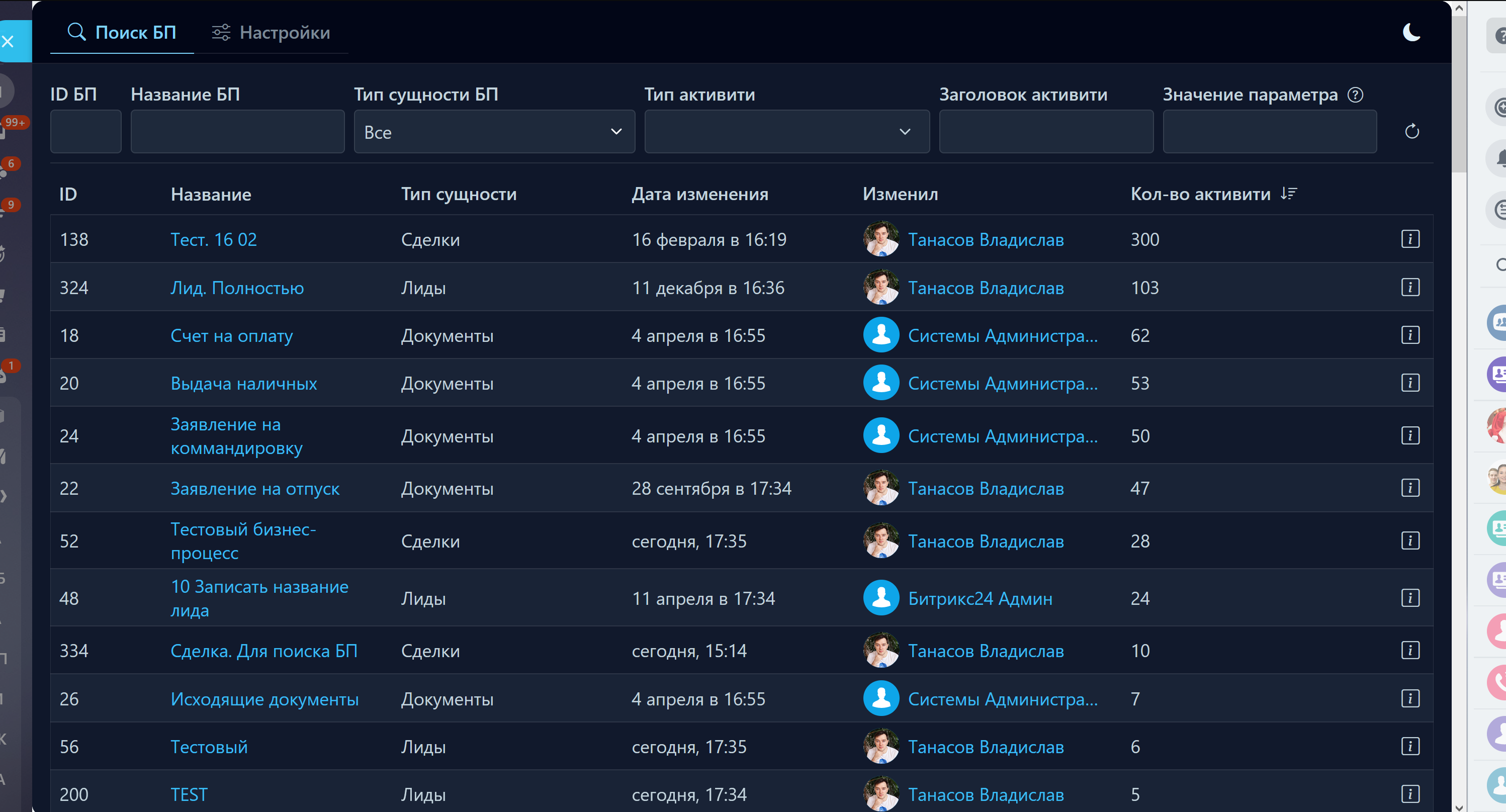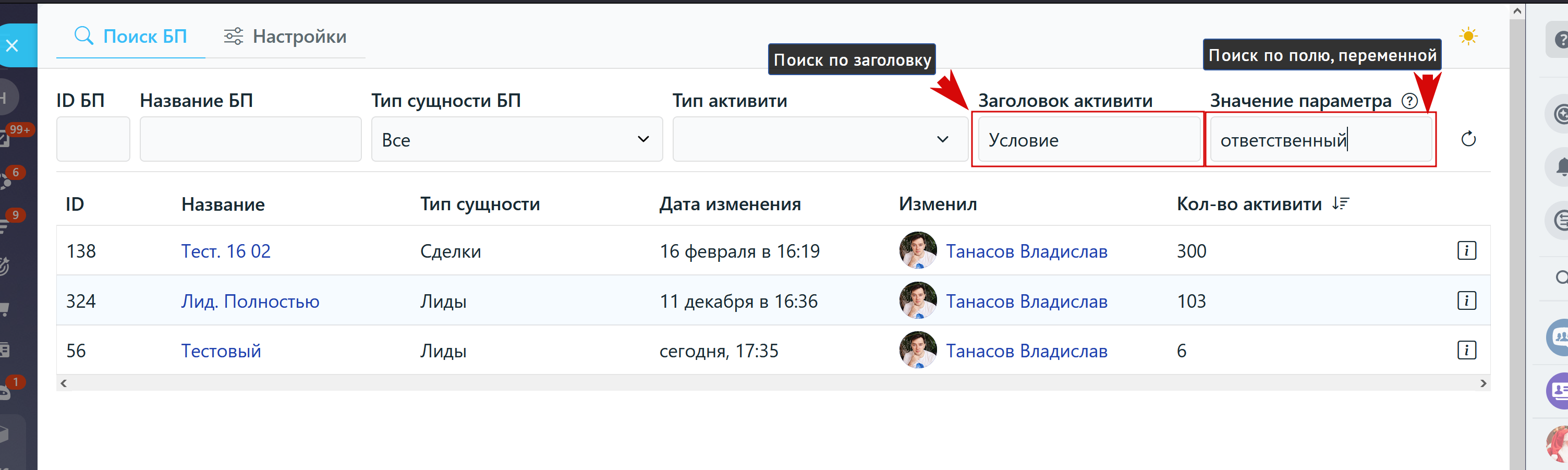 - Поиск по типу активити, названию (заголовку) активити, полям, переменным;