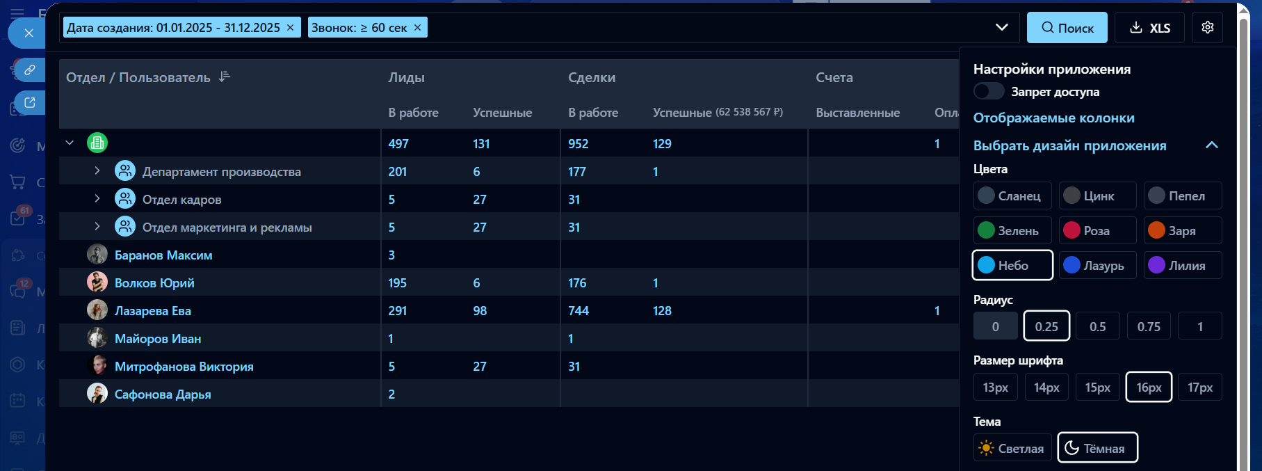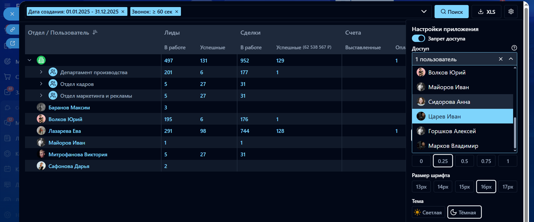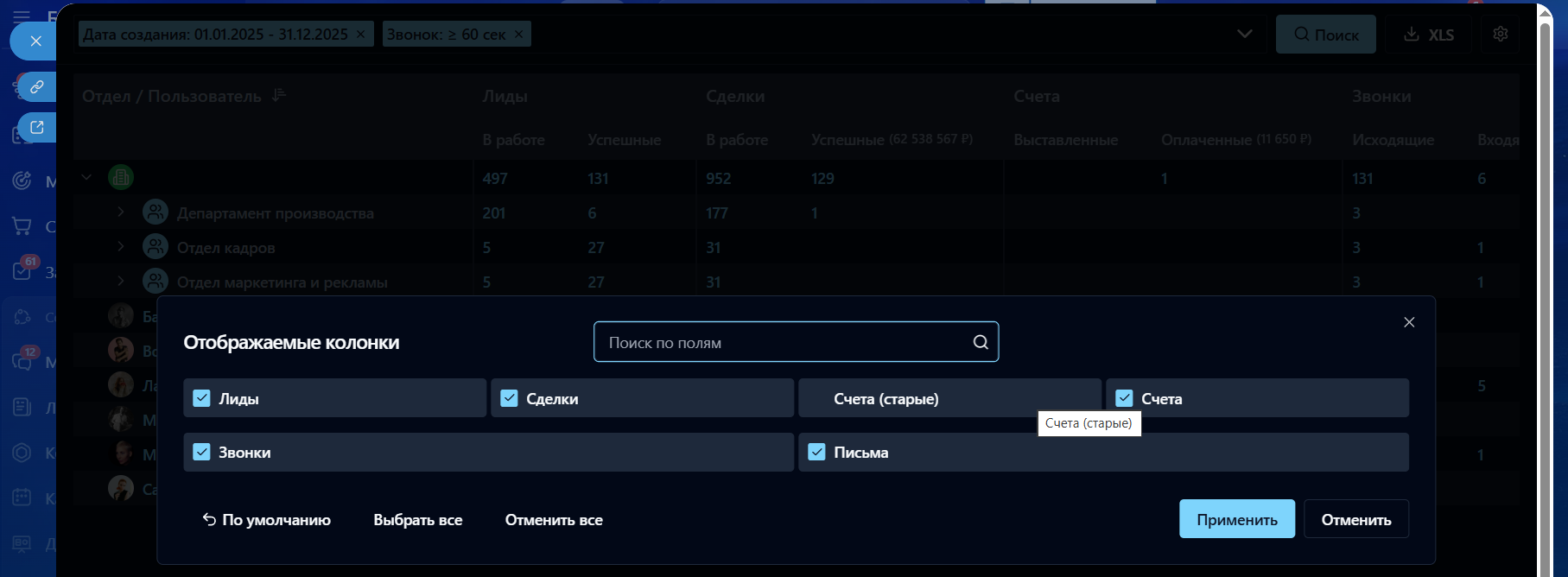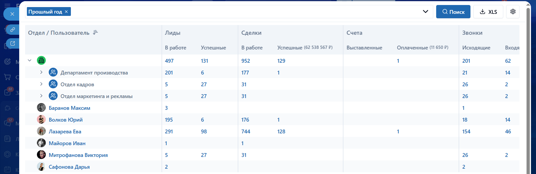 Данные по показателям отделов и сотрудников этих отделов: лиды, сделки, счета (новые и старые), звонки, письма.