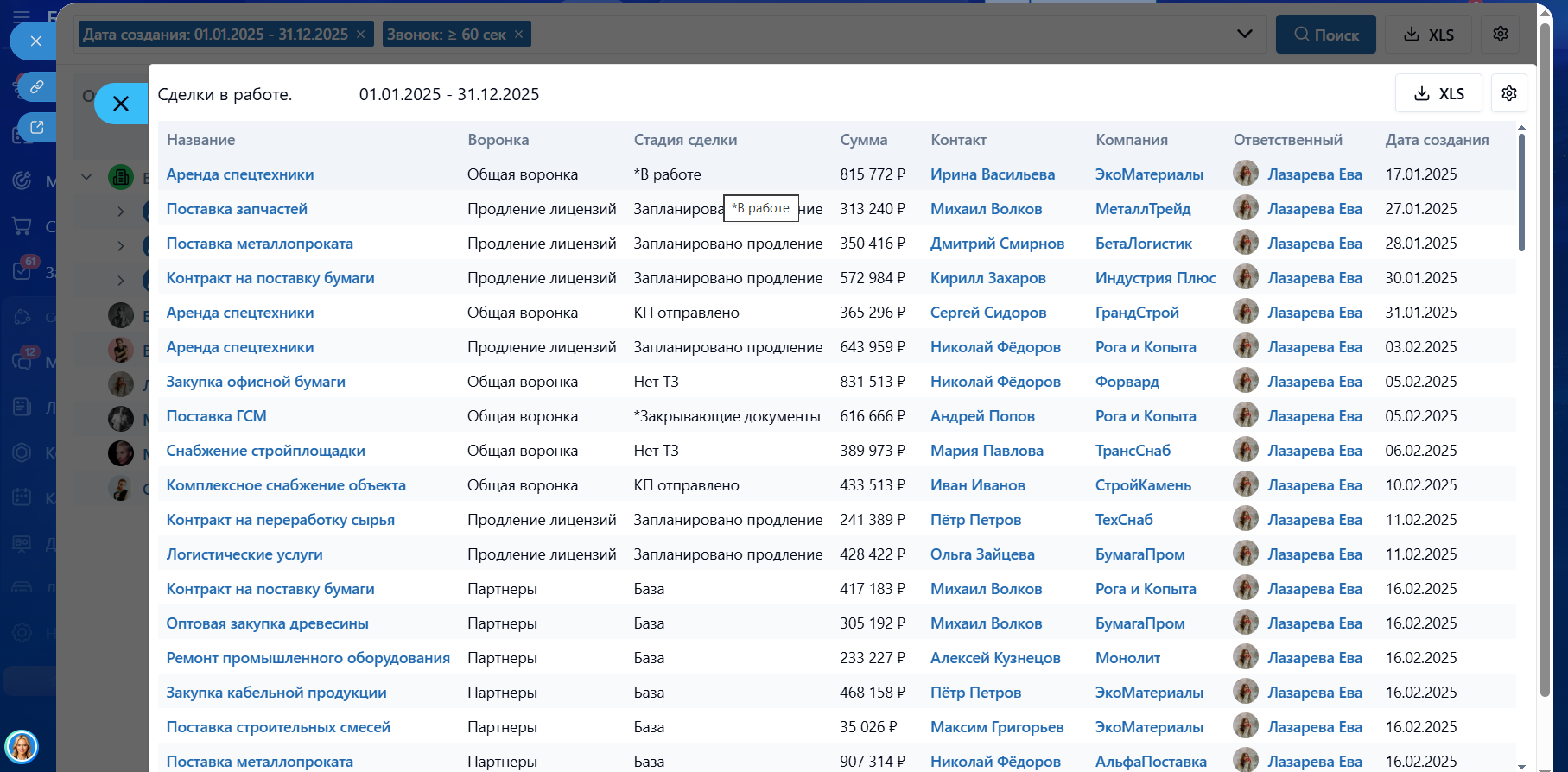 Лиды, сделки, задачи, счета. В работе, без дел, просроченные