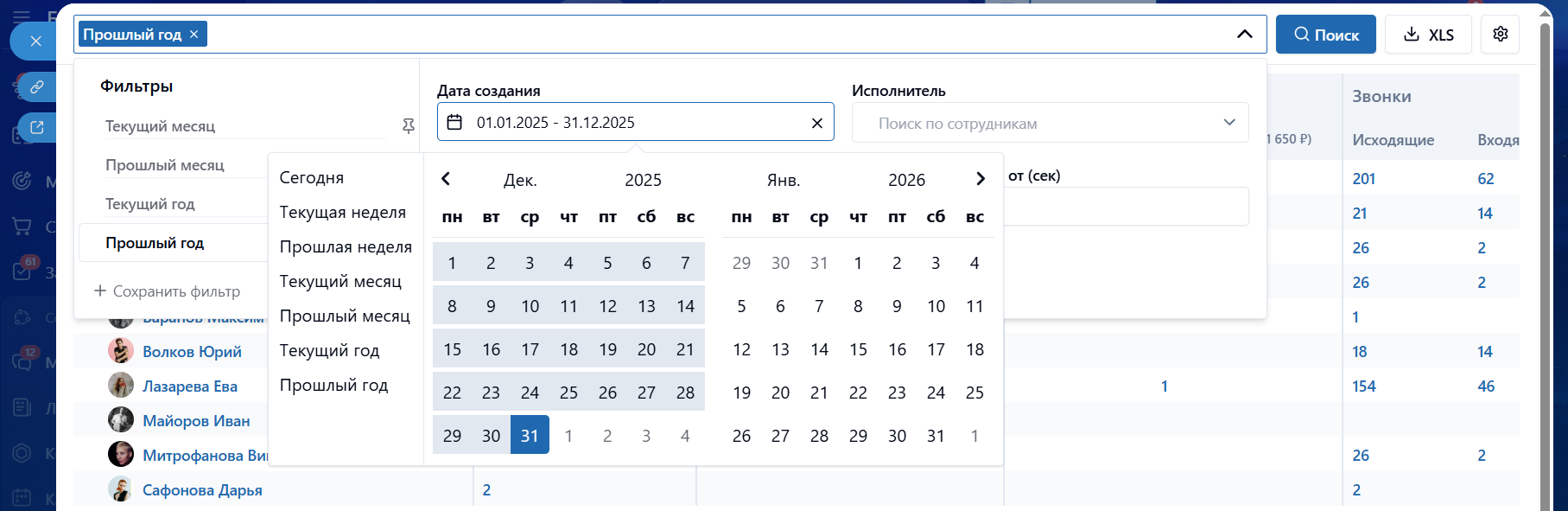 • Пресеты (текущий месяц, прошлый месяц, текущий год, прошлый год);