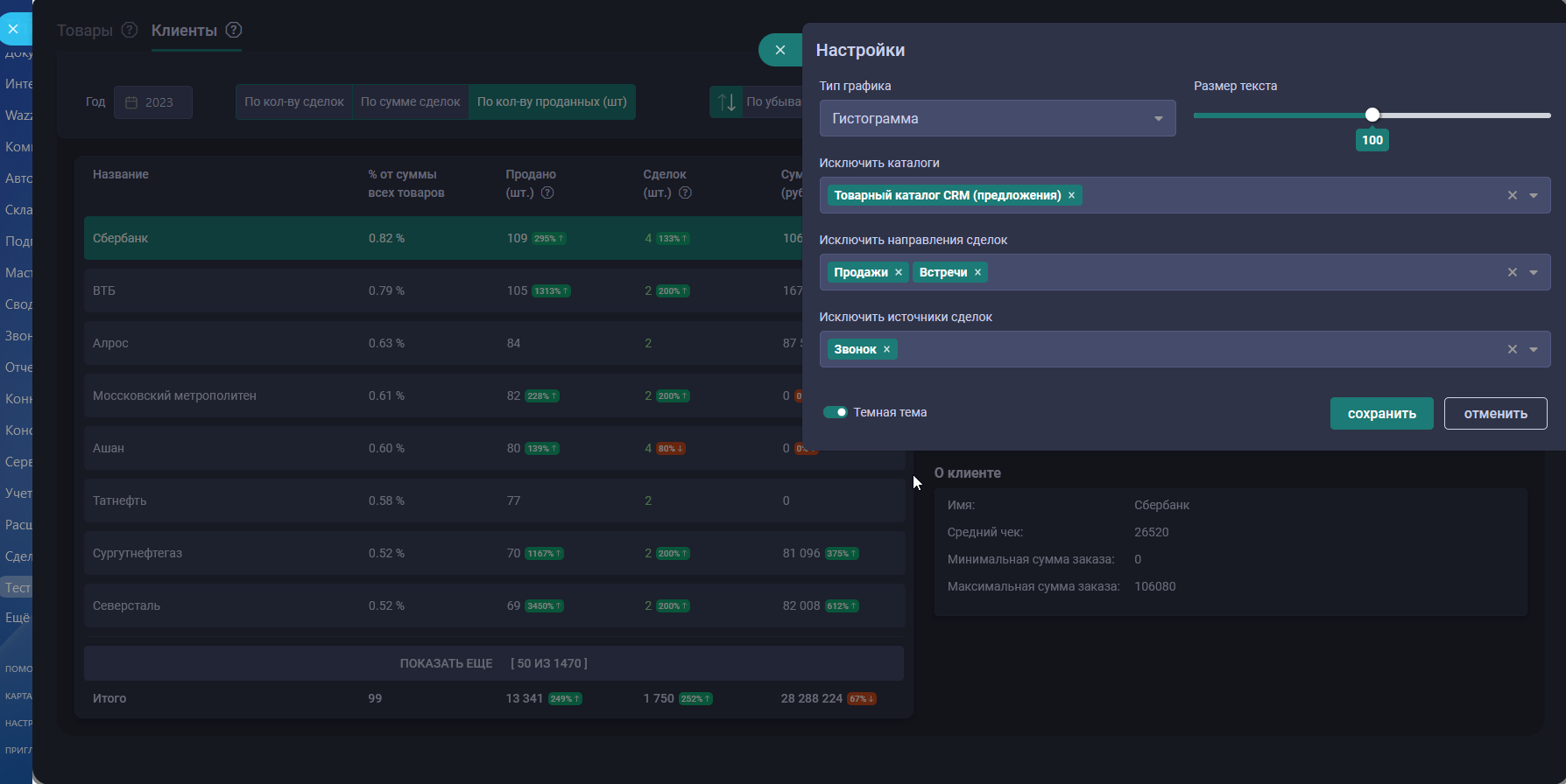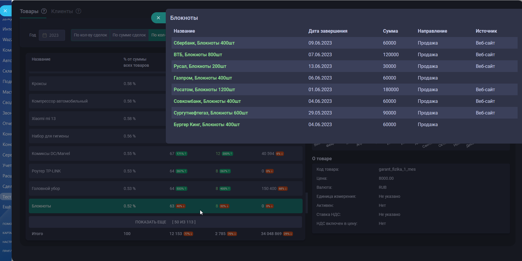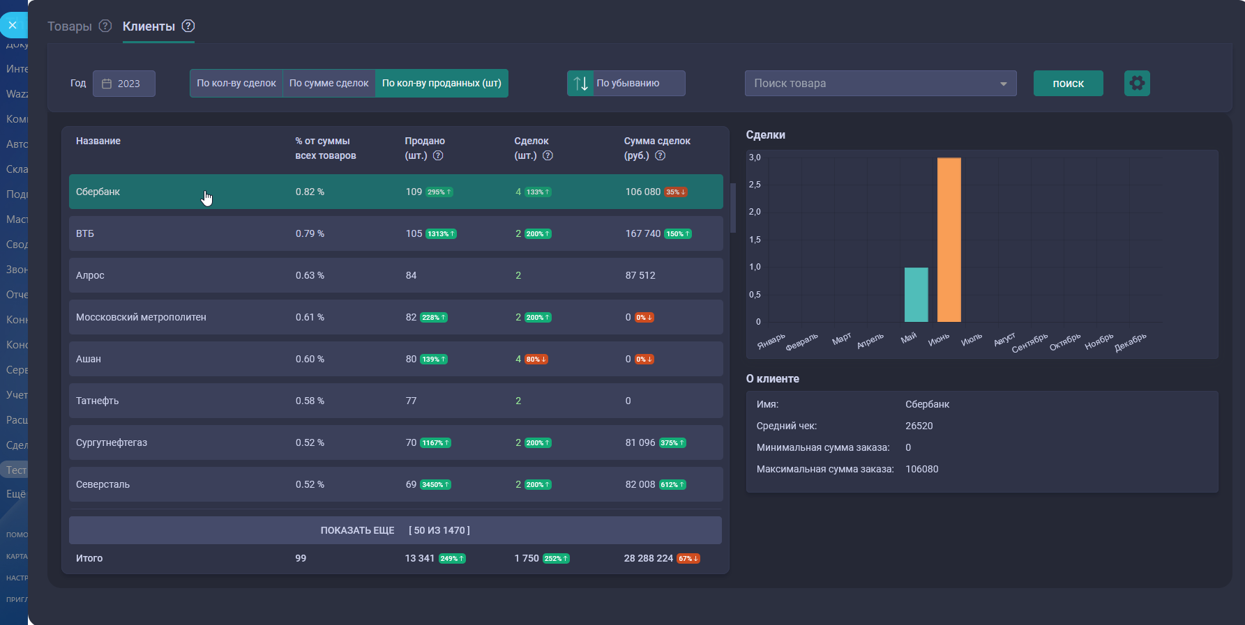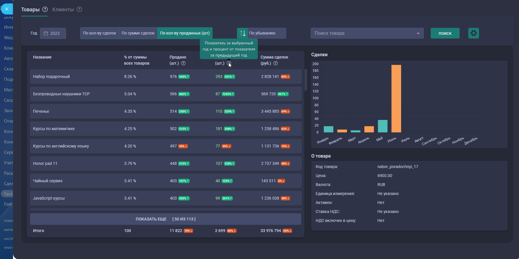 Дашборд показывает рейтинг товаров и клиентов по кол-ву и сумме сделок, а также по количеству проданных единиц. Детально за год по каждому товару можно изучить следующие показатели: продажи, % от общего товарооборота, сделки и их сумма. Есть график по товару: сколько сделок было по месяцам.Рейтинг товаров и клиентов