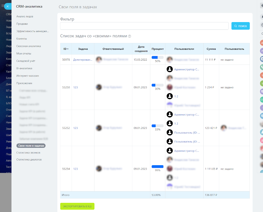 - Находится в аналитике. Поддерживает фильтры по штатным полям и пользовательским;