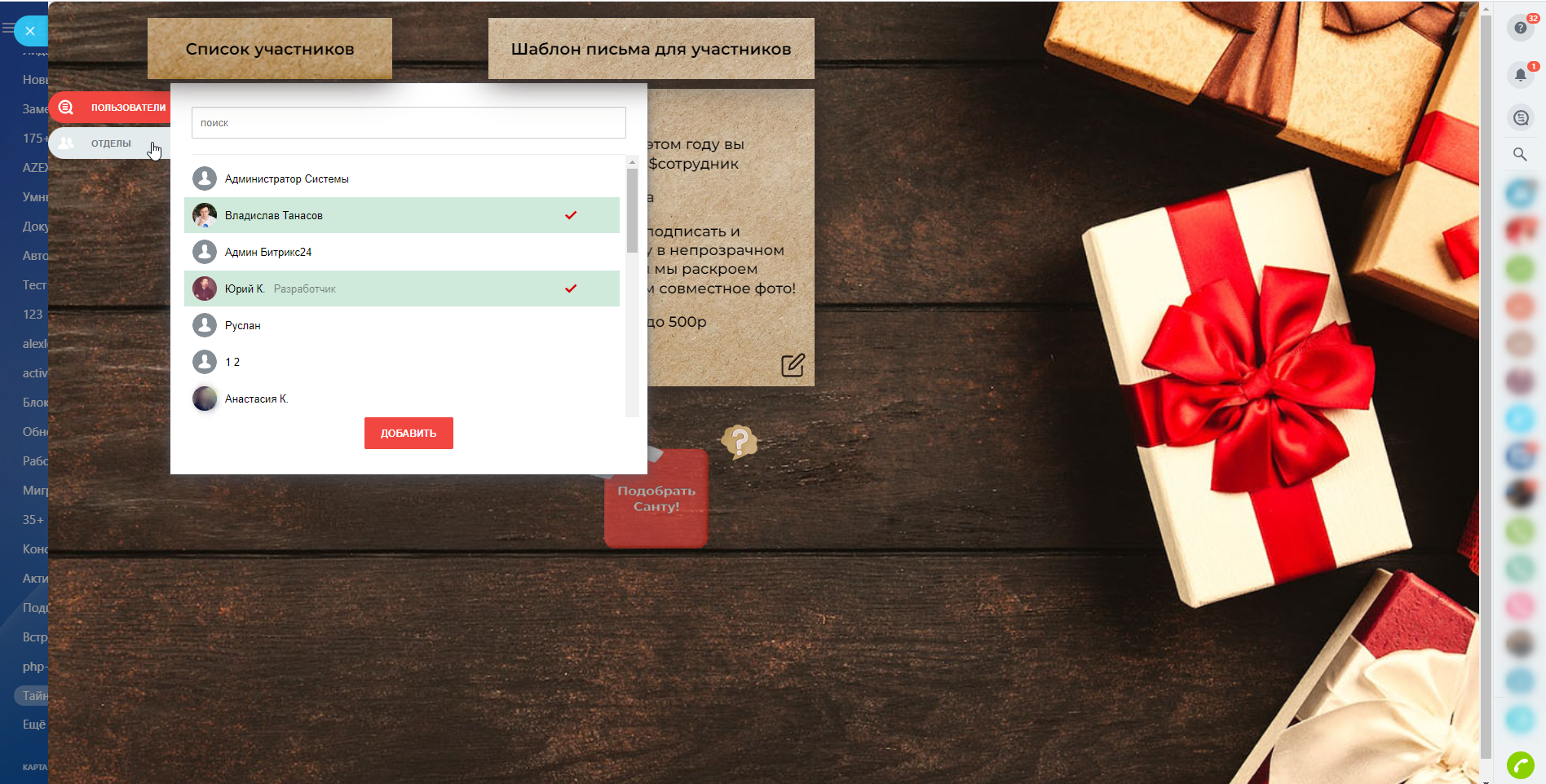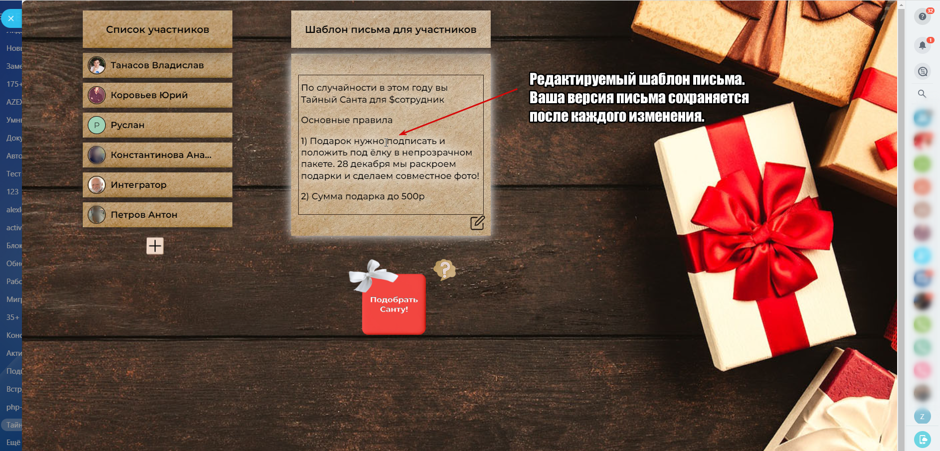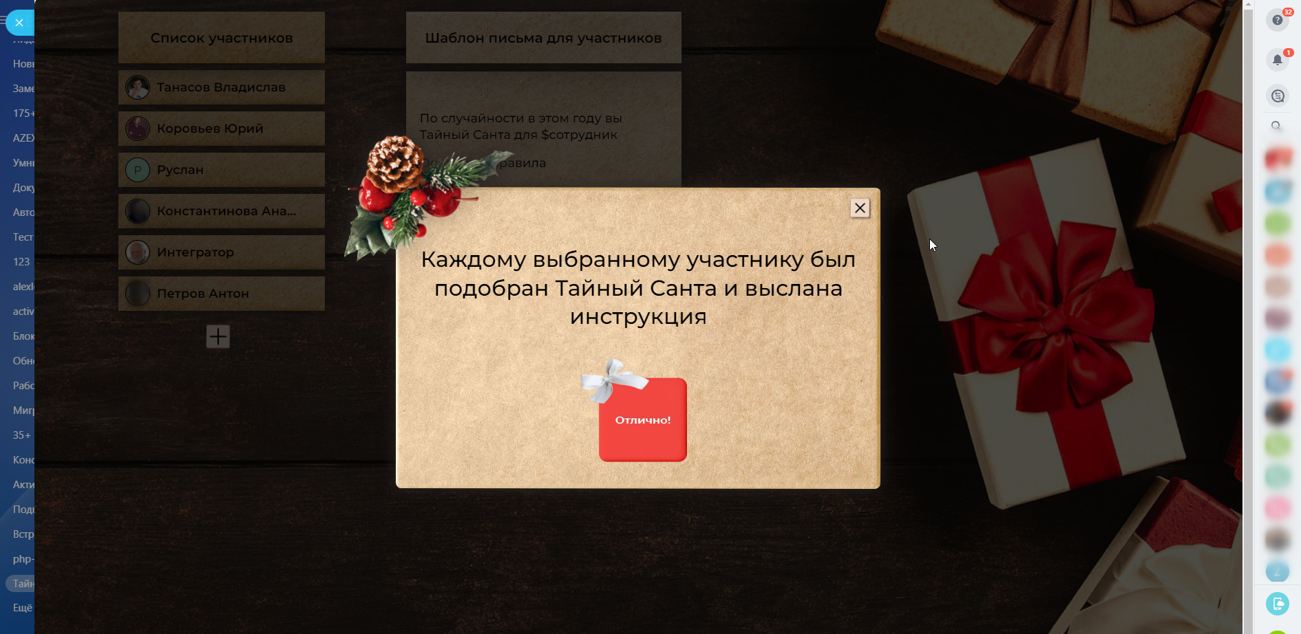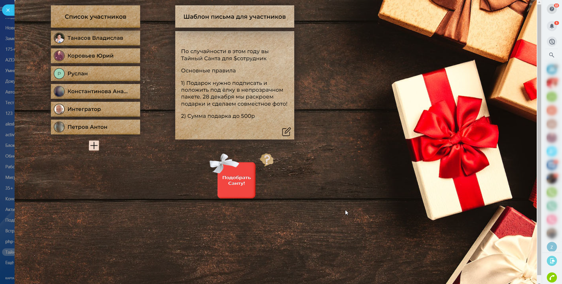 - Каждый получит личное сообщение от чат-бота "Тайный Санта" с указанием правил и сотрудника, которому нужно подарить подарок.