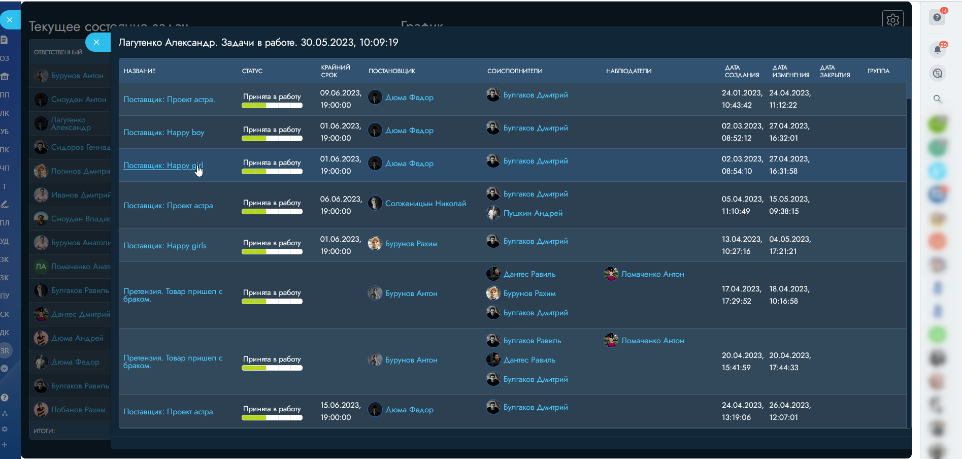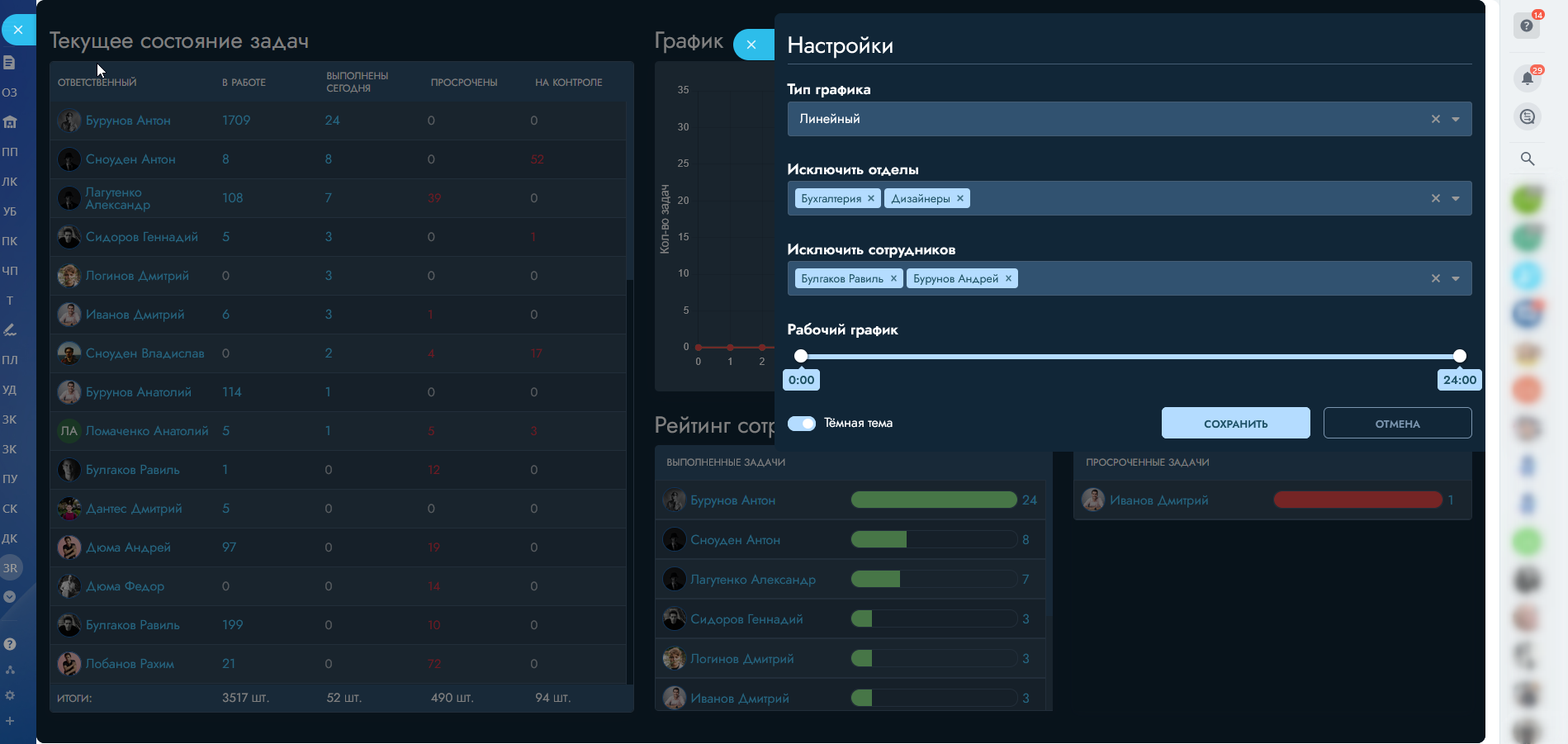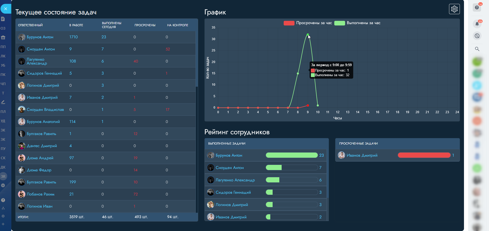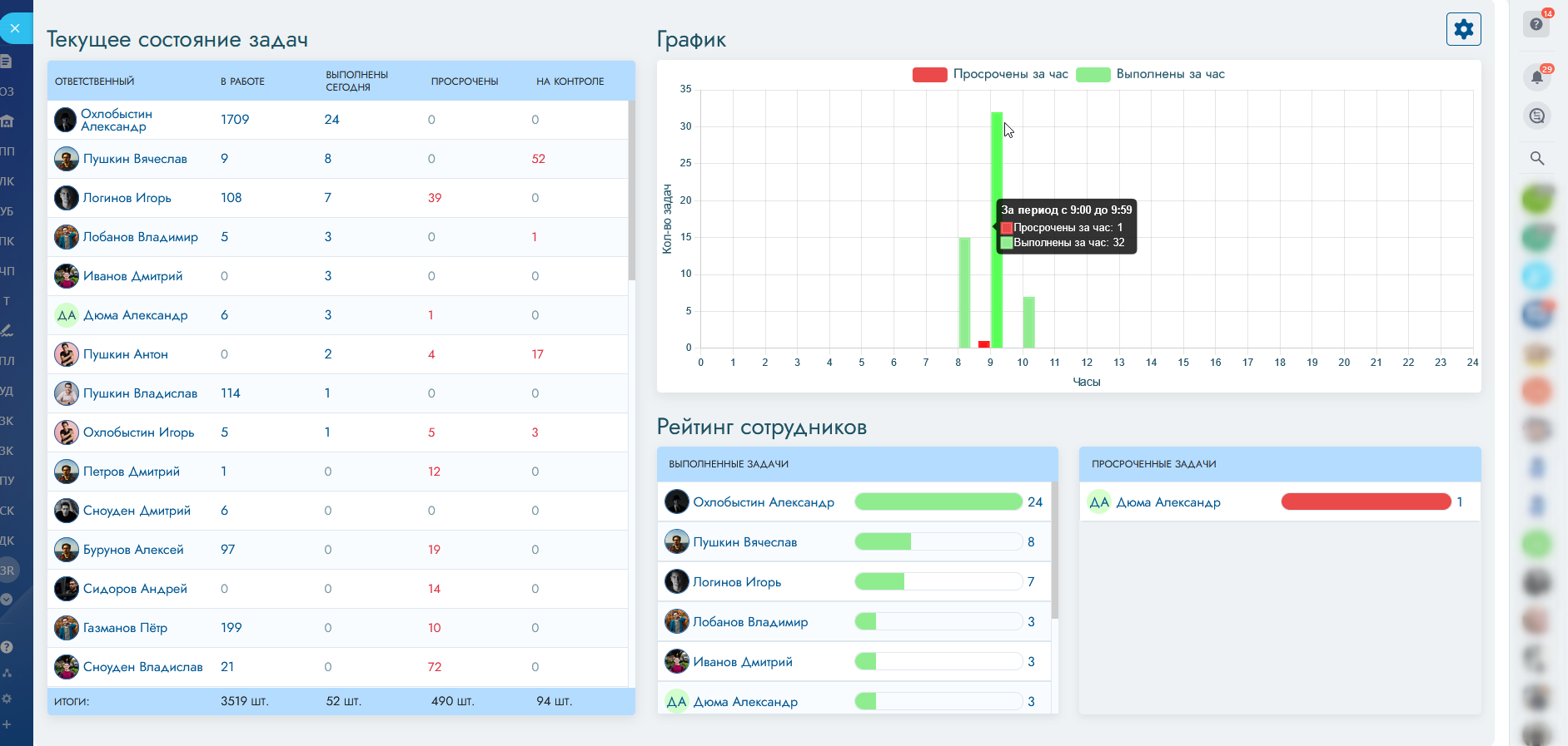 - отображает выполненные и просроченные задачи с разбивкой по каждому часу;