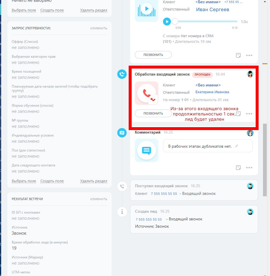 - Если менее Х секунд, то удаляем лид.