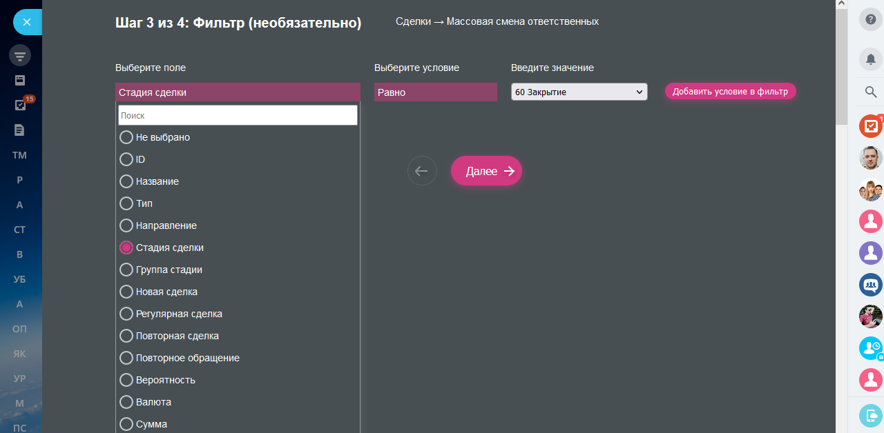 Объемы рассылки выбираются вами самостоятельно, например, чтобы сделать сегодня не более 20 отправок сообщений в WhatsApp по сделкам, вы можете: в случае успешной отправки заполнять скрытое поле (и по нему проверять была ли уже отправка в WhatsApp), использовать счетчик-поле в другой сделке, который будет увеличиваться на 1 после каждой успешной рассылки.