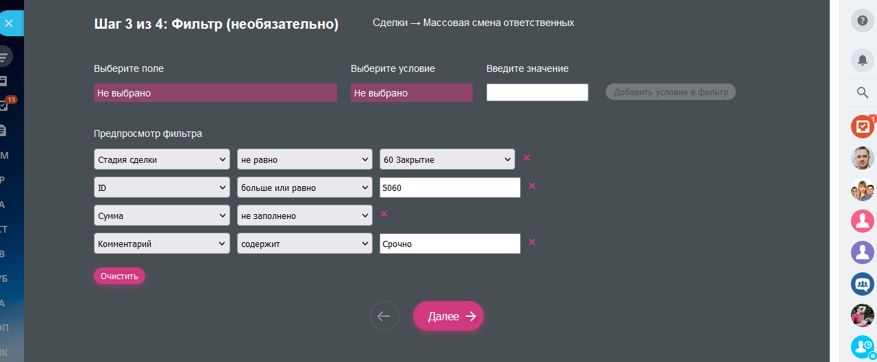 - Добавлена возможность выбрать параметры (на шаге с фильтром). Поддерживаются параметры: строка, число, список, "Да/нет".