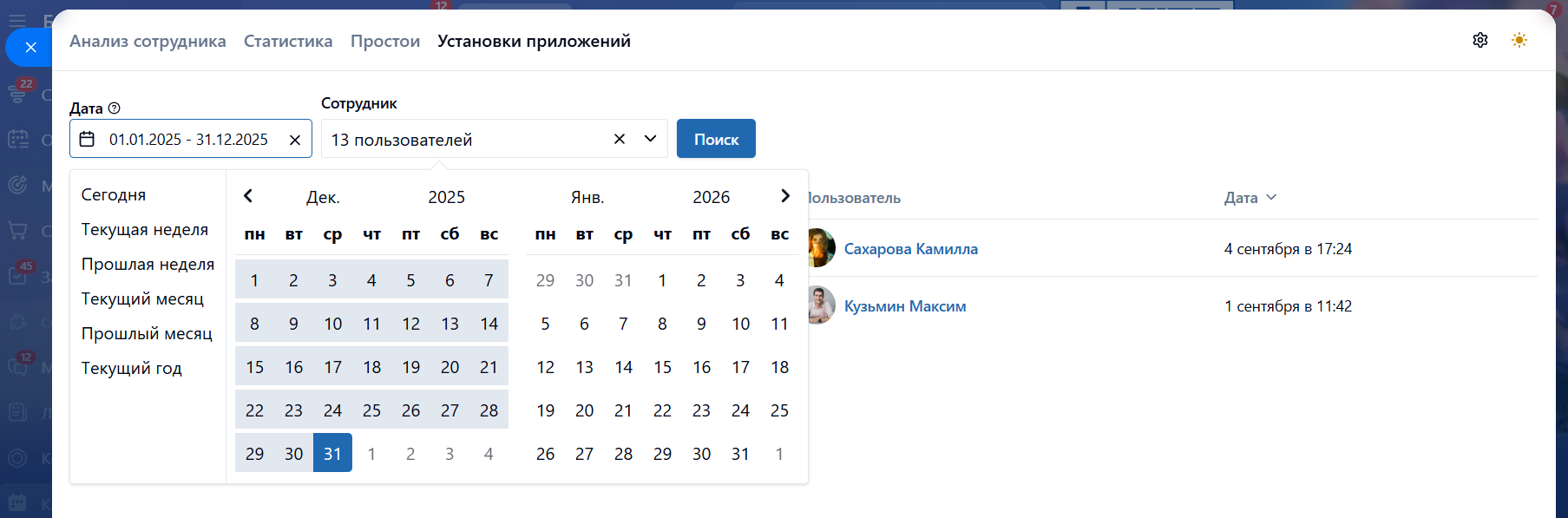 • Установка приложений. Какие приложения для Битрикс24 устанавливали сотрудники: кто и когда.