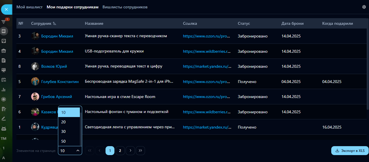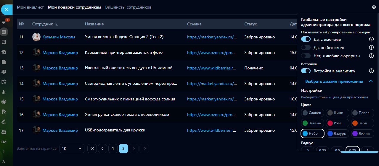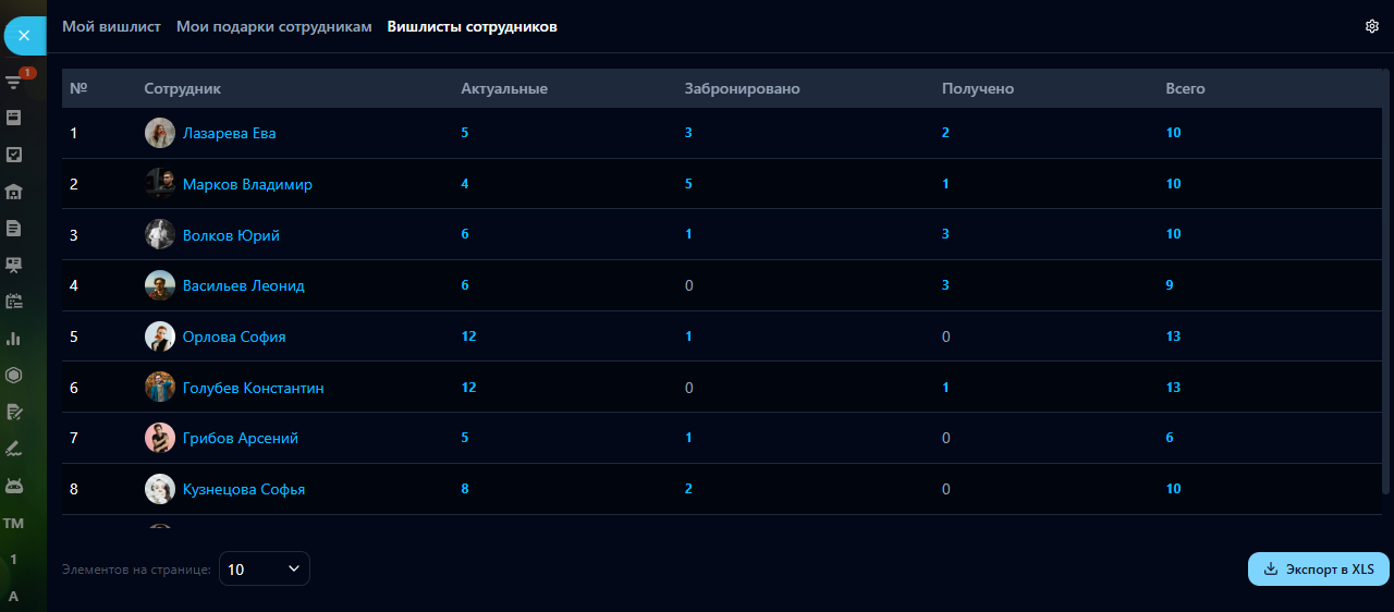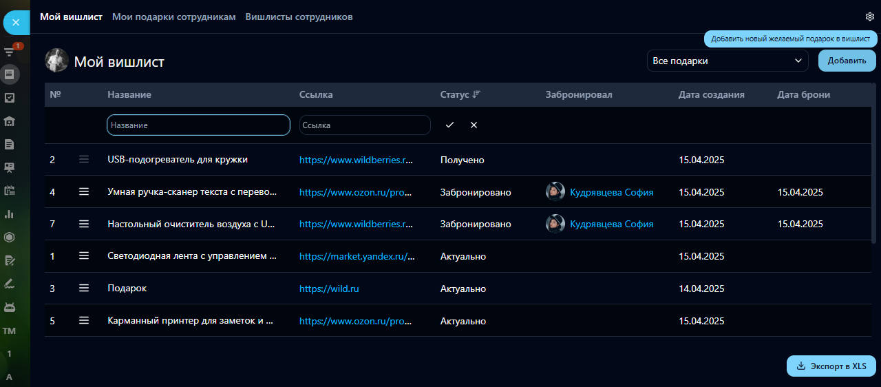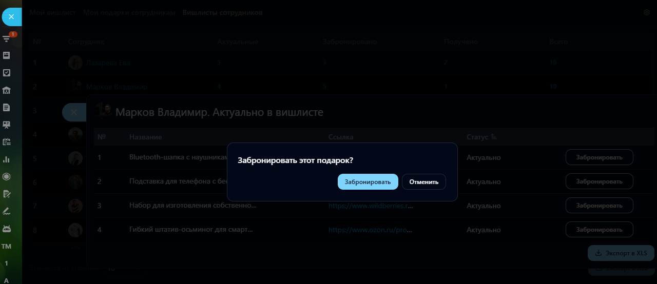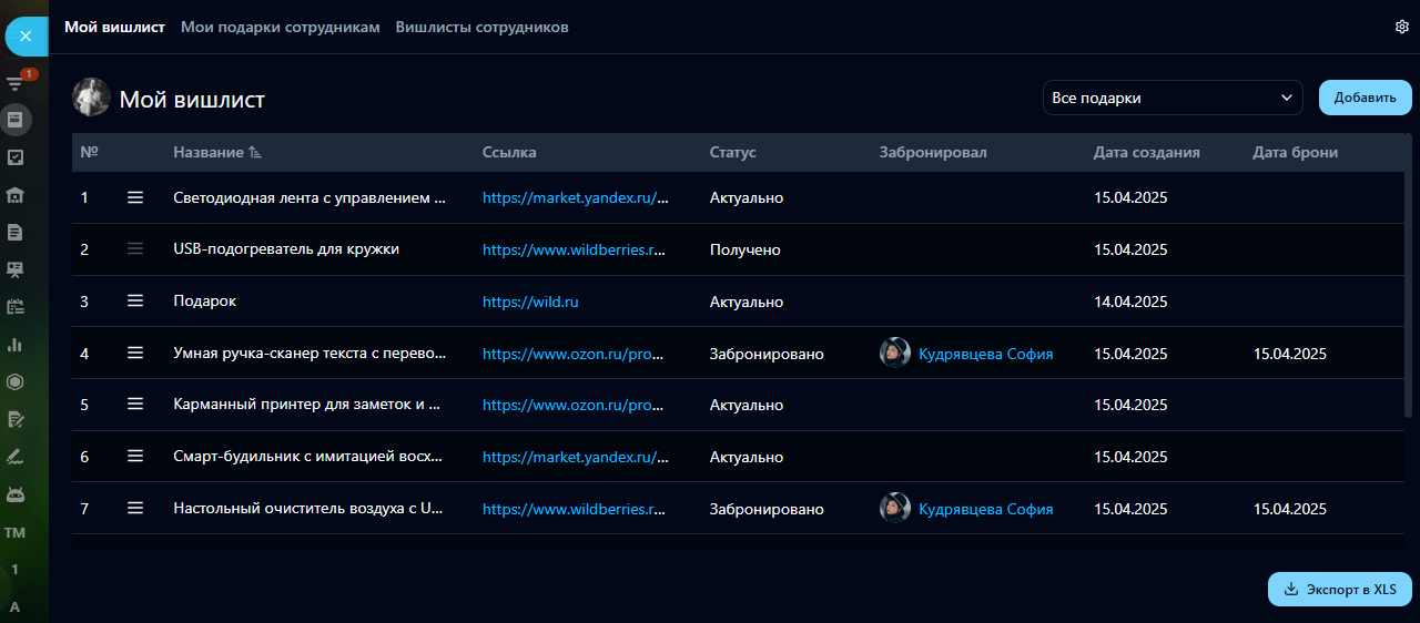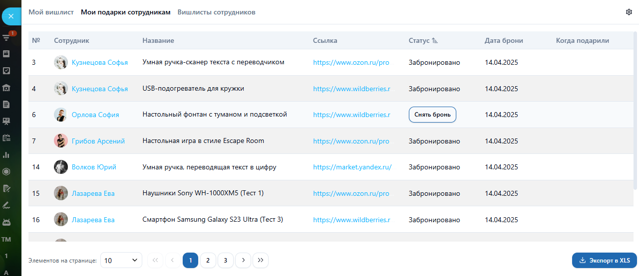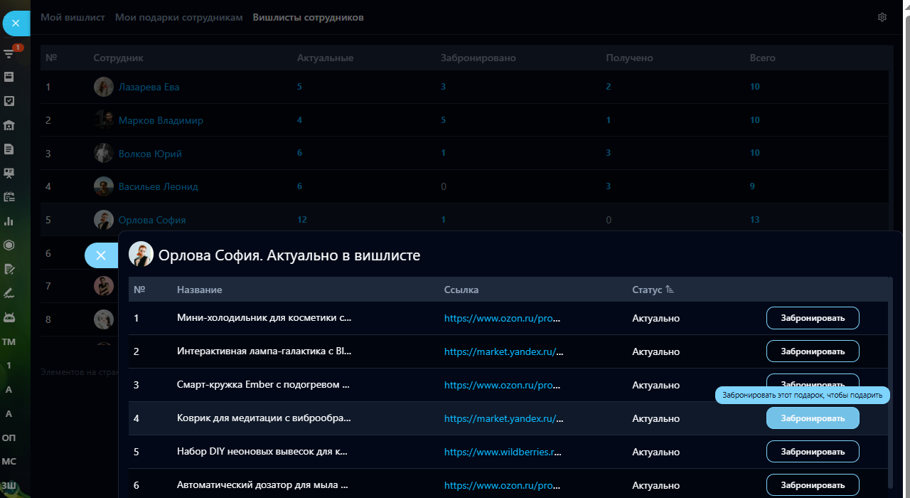 Видеть вишлисты других сотрудников, и, при желании забронировать подарок и подарить его;