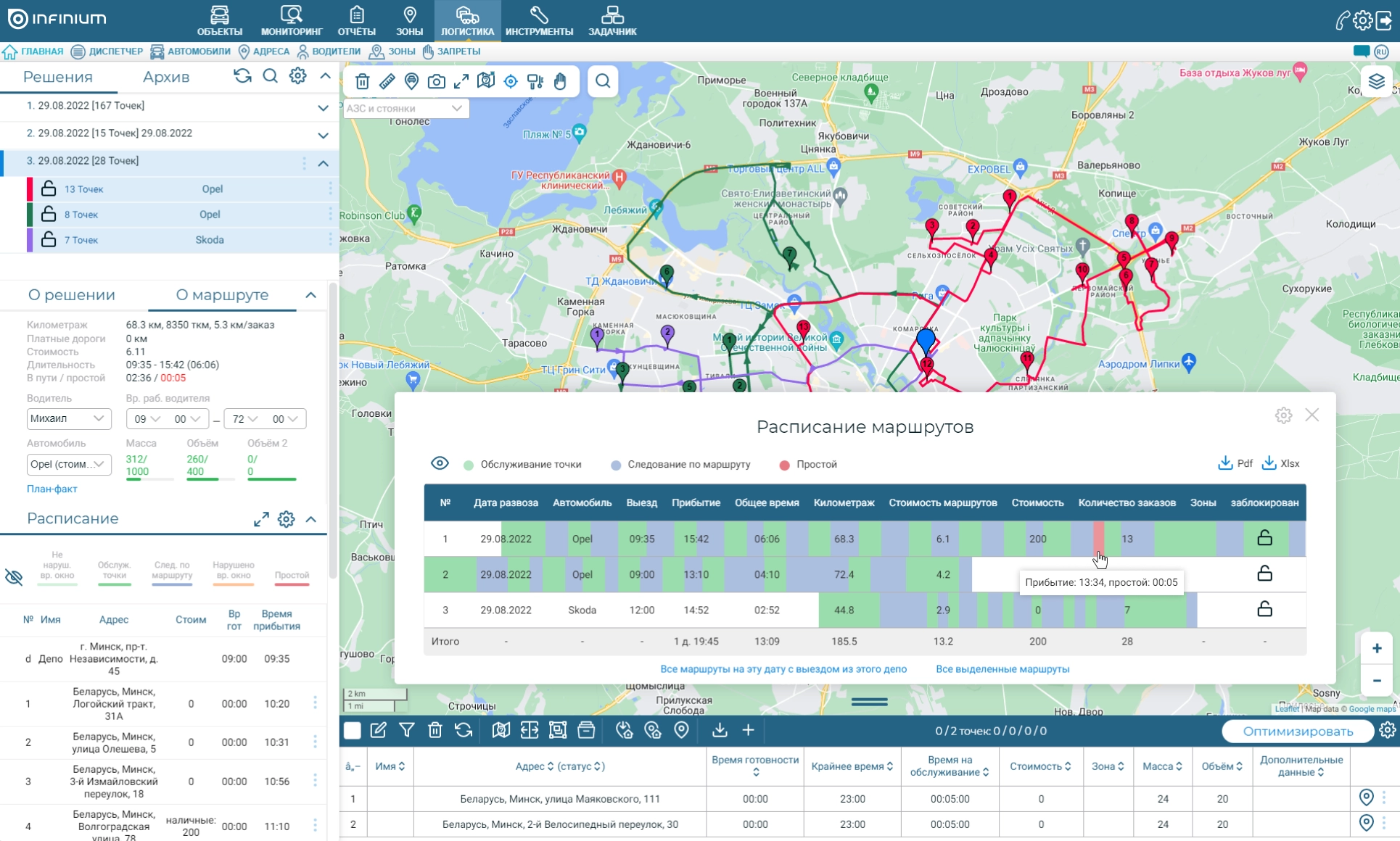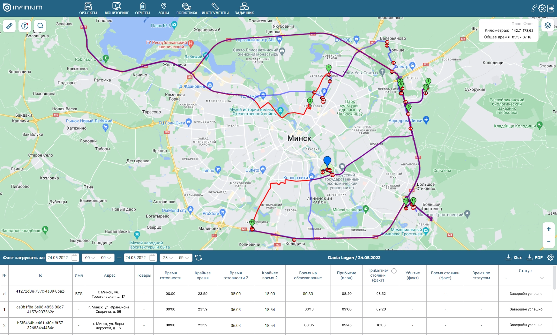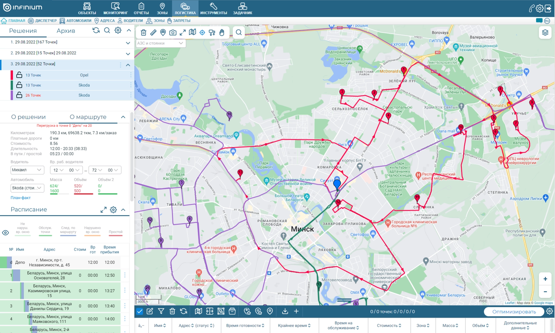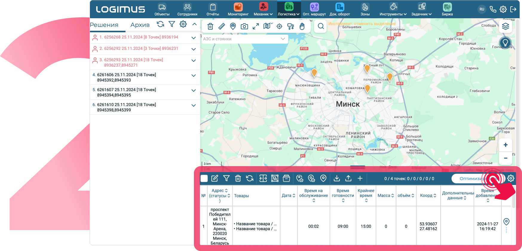Logimus — комплексная TMS-система оптимизации логистики доставки онлайн-платформы Infinium на базе Искусственного интеллекта и Big Data-прогноза транспортных потоков на дорогах индивидуально для каждого типа автомобилей.