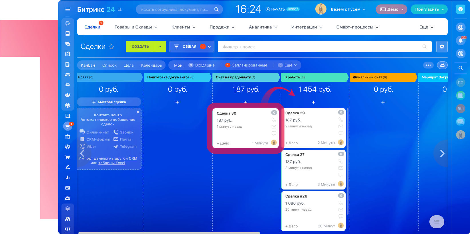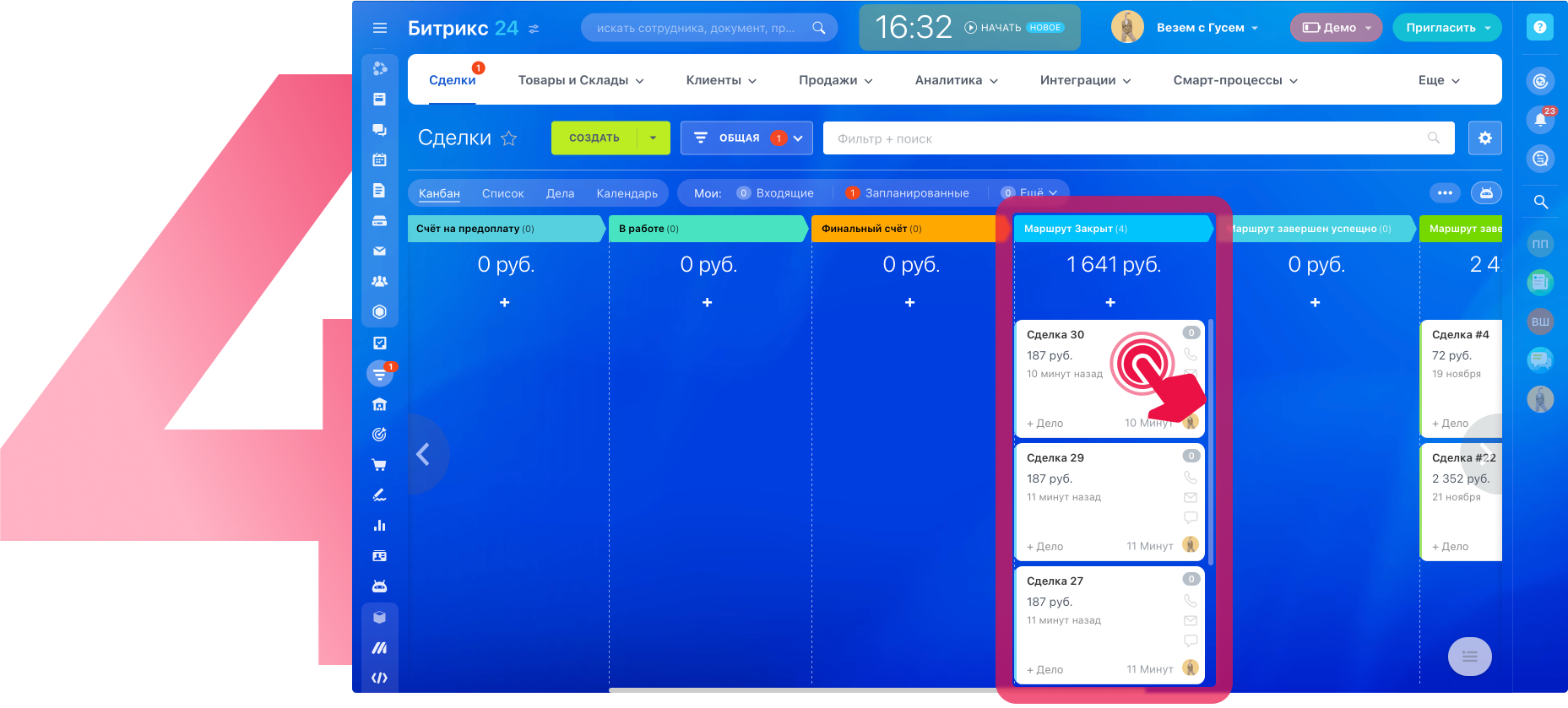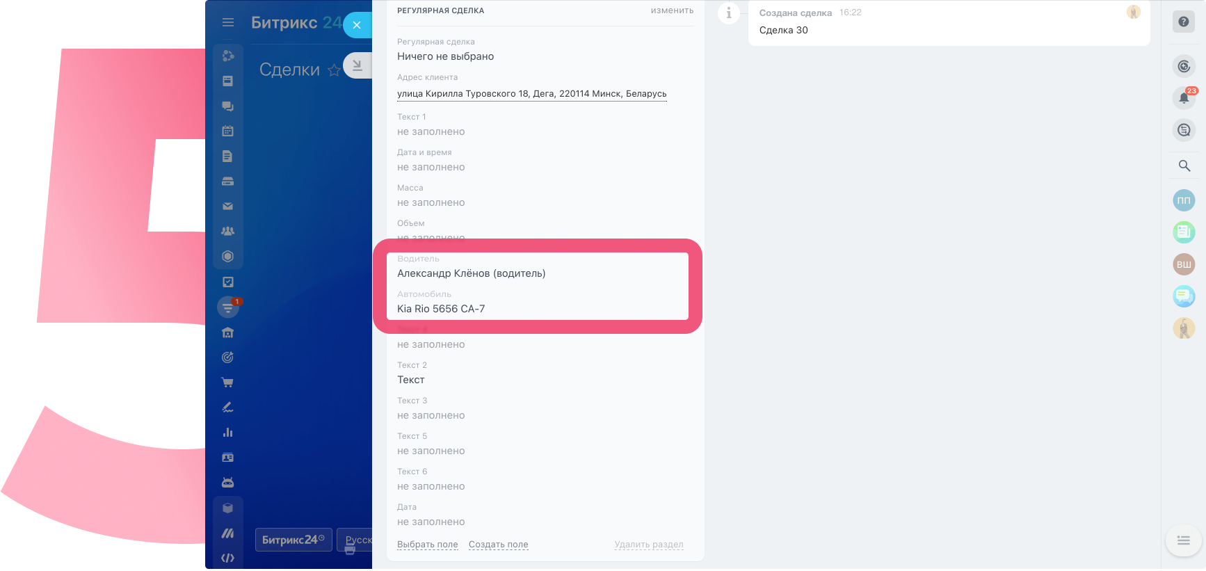 В рамках данной интеграции при переходе сделки в Bitrix на определенный настраиваемый этап, происходит передача логистической части информации о сделке в Logimus (адрес дома, желаемое время доставки, ее вес/обьем и т.д.) В Logimus, таким образом, формируется список адресов заказов. Далее по этим заказам формируются оптимальные маршруты. На маршруты назначаются автомобили и водители. Оптимальные маршруты и задания на доставку передаются водителям/курьерам на мобильные приложения Logimus. В процессе доставки курьеры отмечают статусы выполнения доставки, информация об этом отправляется обратно в Bitrix24. Также в Logimus происходит сравнение План/Факт, автоматически выявляются нарушения, производится расчет эффективности доставки.