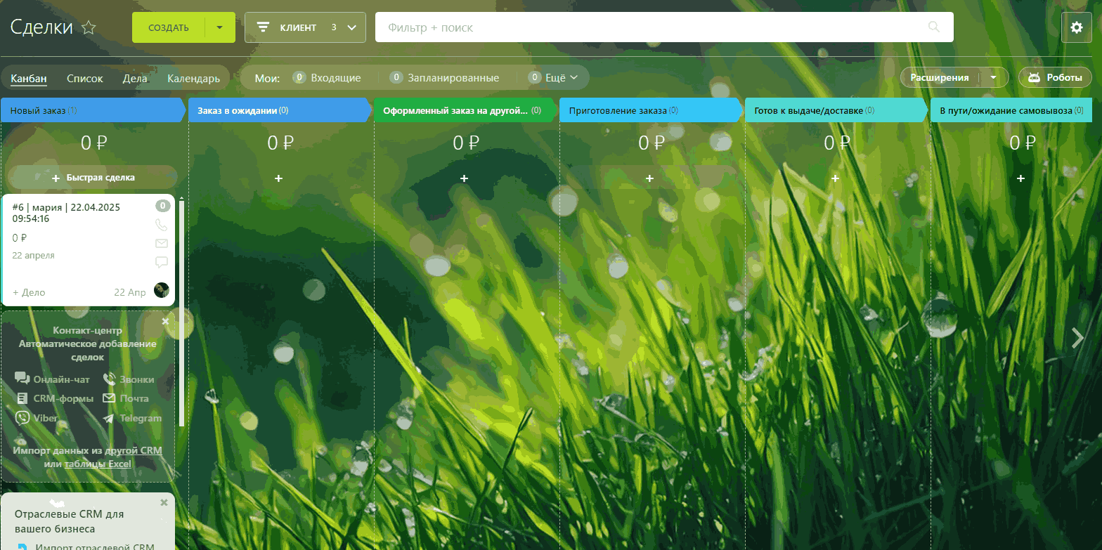 - Новый клиент — поступает первая информация о заказе, уточняются детали, заявка регистрируется и передается специалистам для последующей обработки