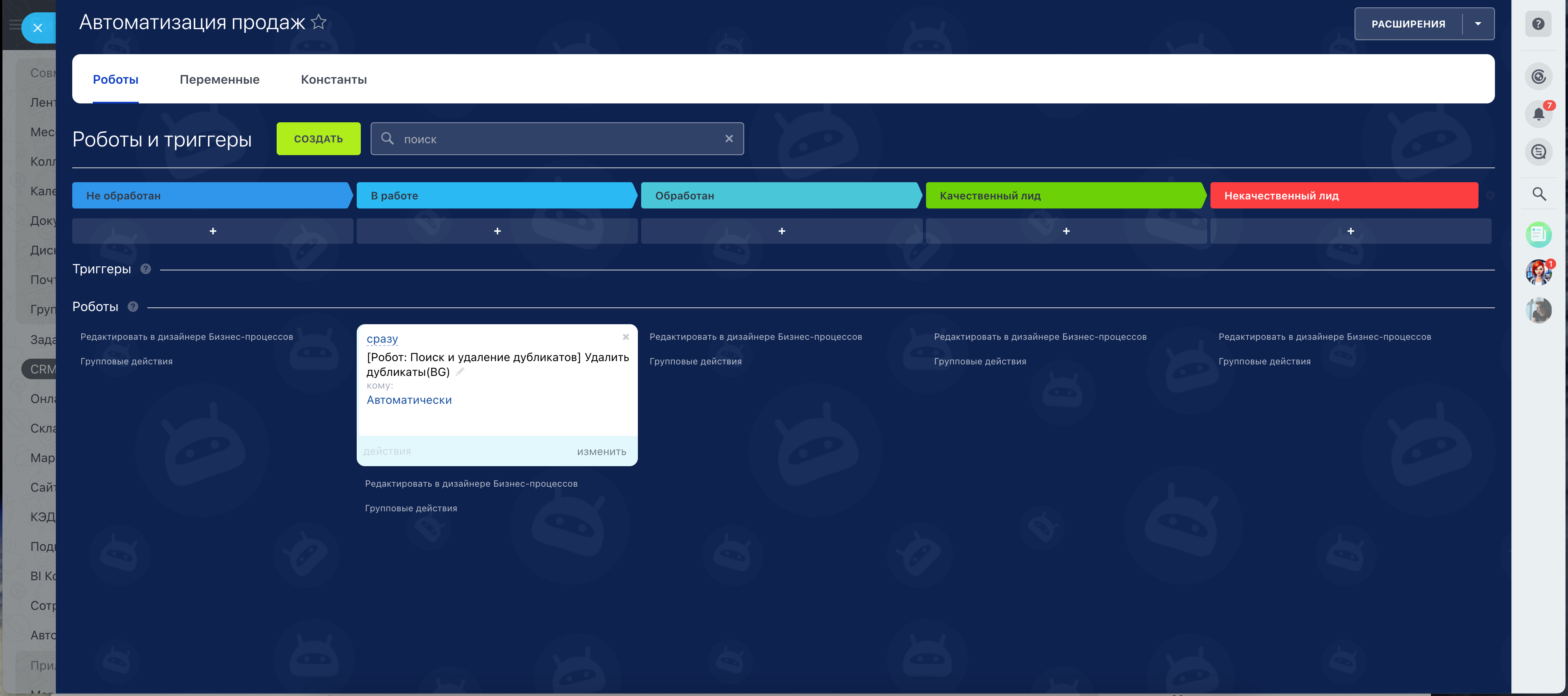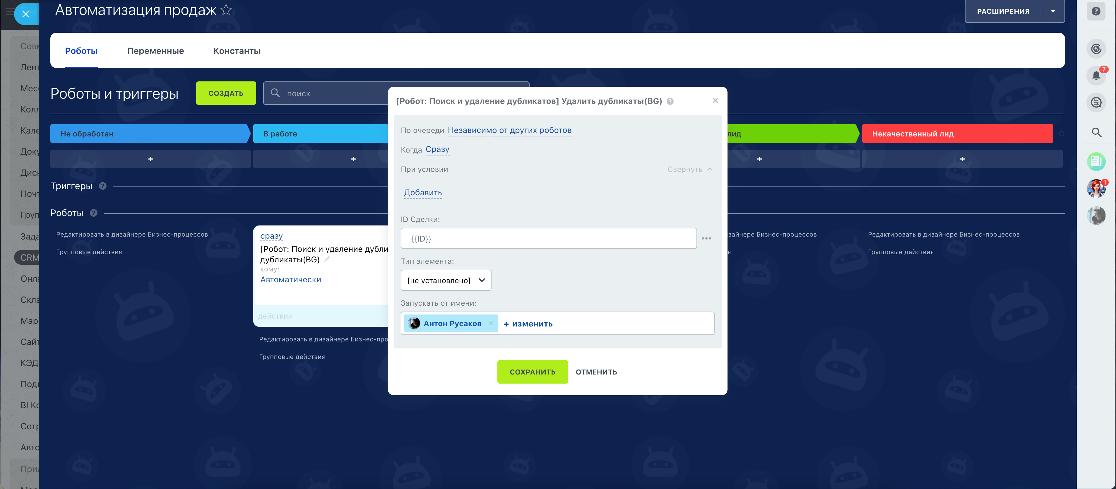 Робот анализирует данные по ключевым полям (контакты, телефоны, email, названия) и оставляет только один актуальный элемент, очищая CRM от лишних записей.