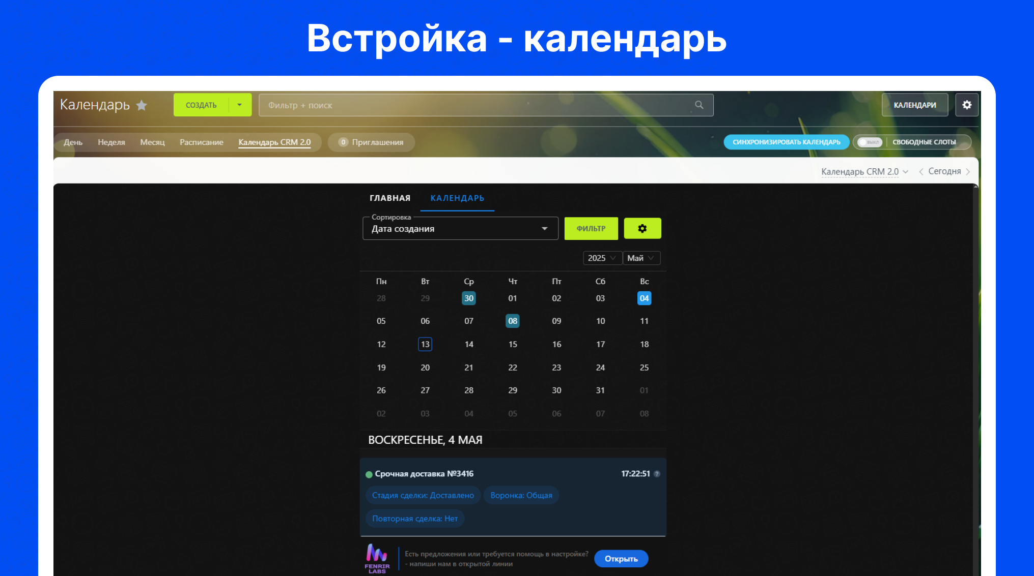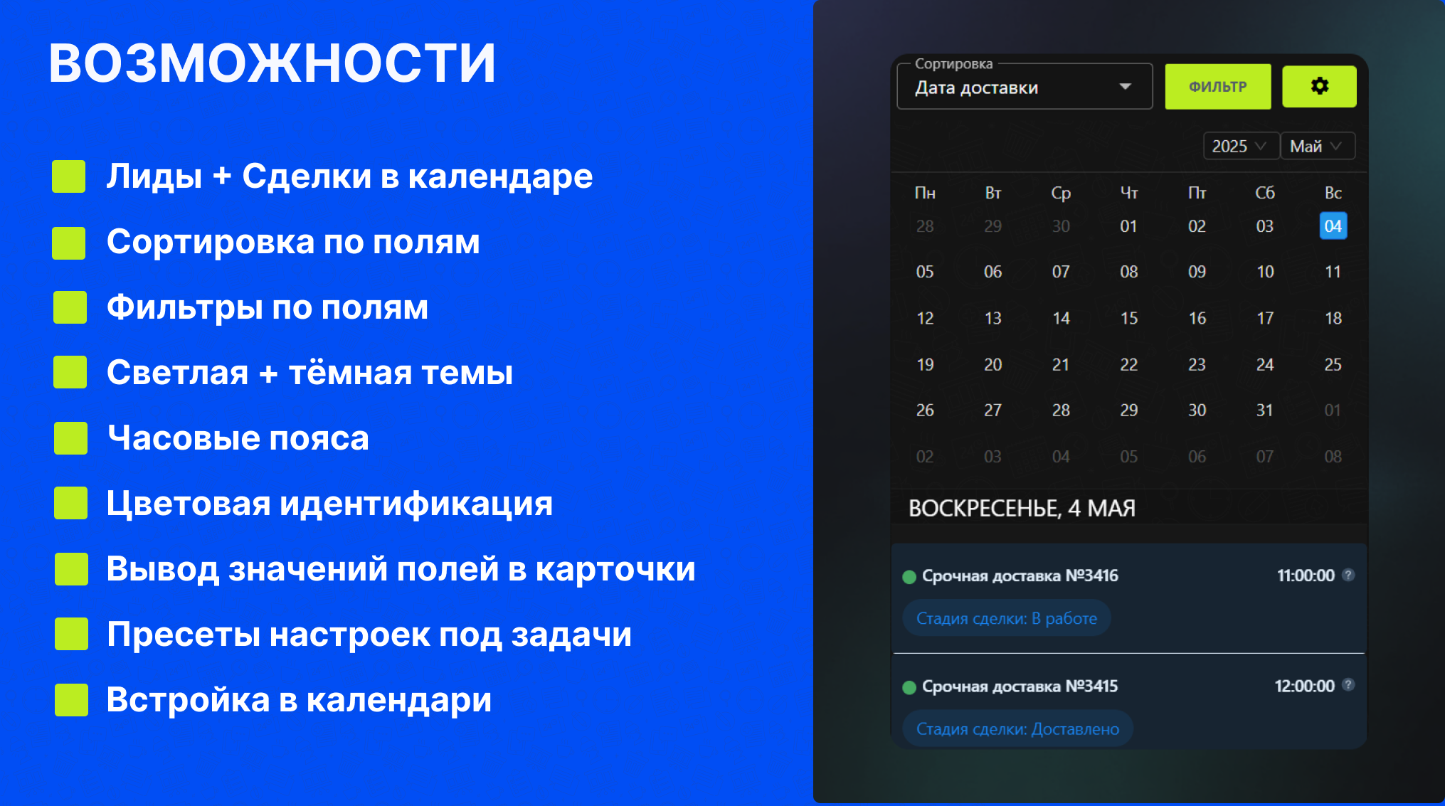 • Менеджерам по продажам: Для легкого отслеживания времени доставки товаров, встречи с клиентами и других ключевых событий, которые происходят в рамках сделок/лидов в календаре.