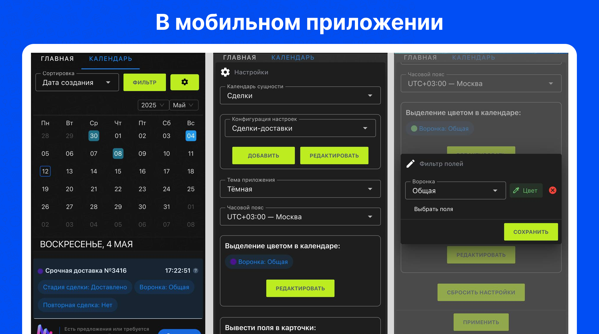 которые помогают быстро ориентироваться в событиях и типах задач. Календарь имеет режимы работы не только в мобильном приложении, но и встраивается в лиды, сделки и календарь в пк версии.