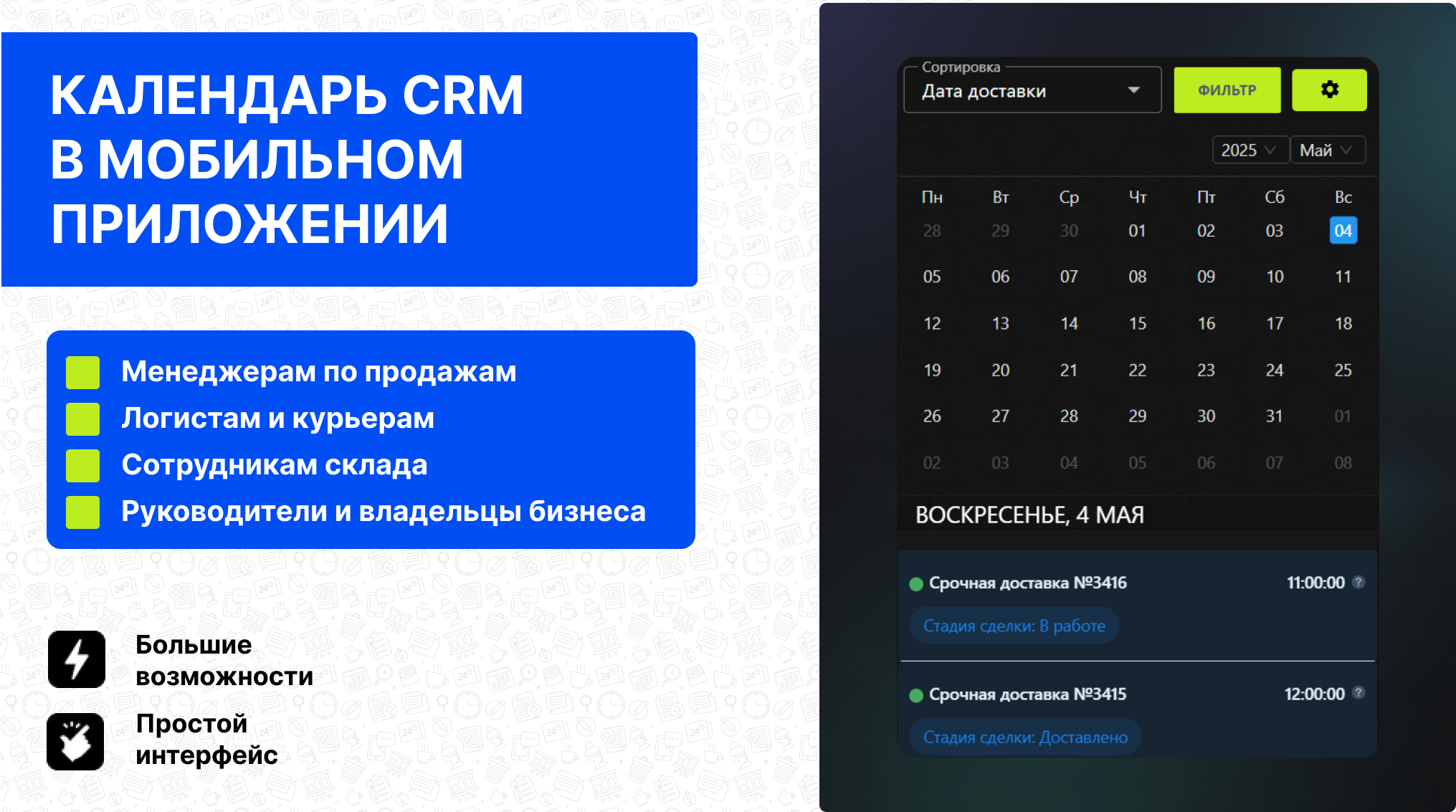 Основная цель приложения — упрощение и ускорение взаимодействия с CRM в мобильном формате, позволяя быстро находить нужное время для доставки,