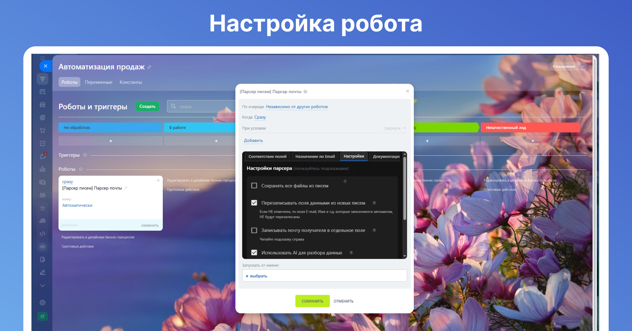 Если на почту поступают письма, с помощью этой настройки можно задать, какое слово из сообщения будет автоматически размещено в нужном поле карточки лида, контакта, компании или сделки.