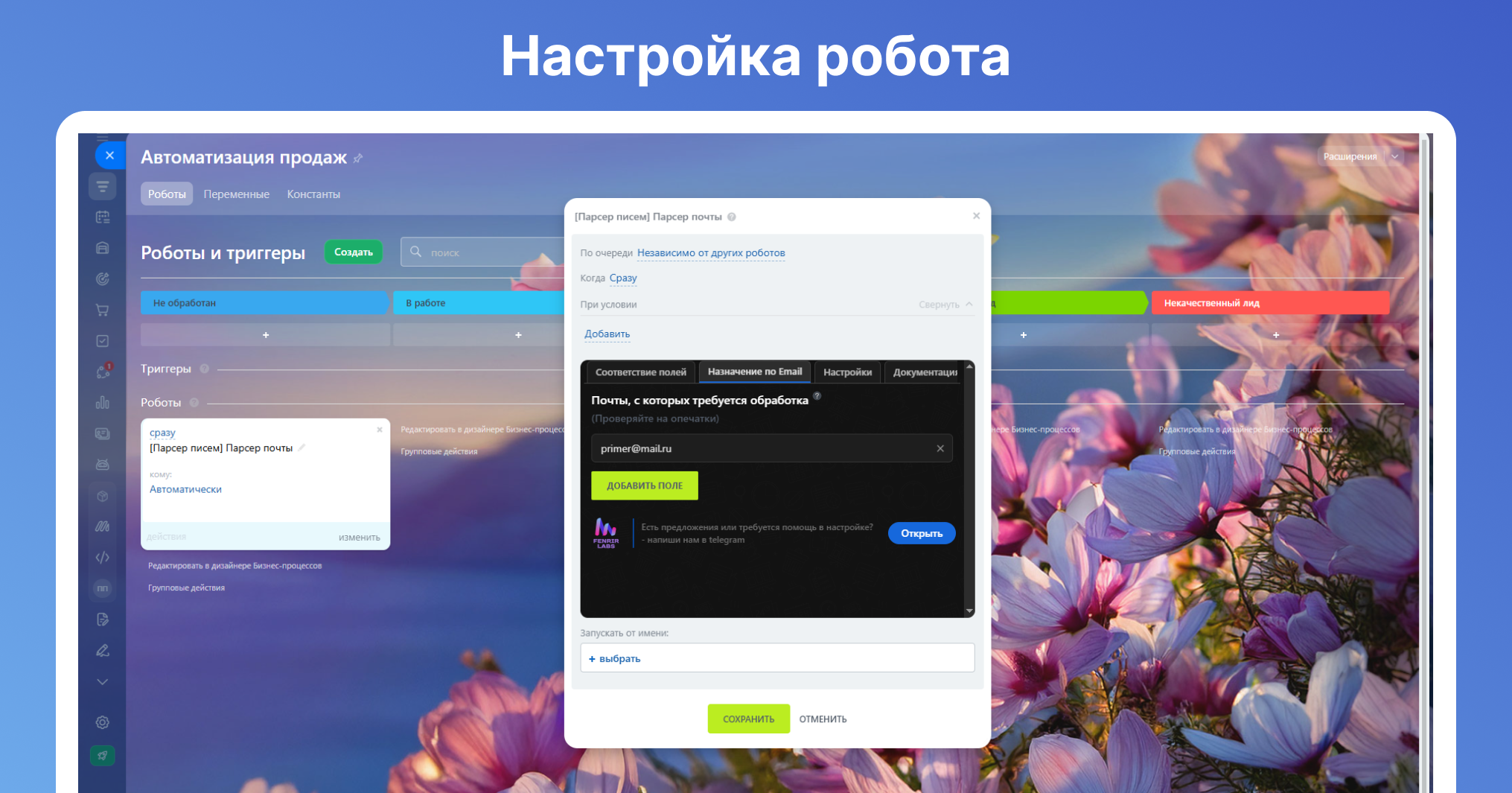Если у вас подключена почта к CRM, то менеджеру приходится вручную заносить данные из писем в карточку лида/сделки. Данное решение позволяет автоматизировать этот процесс. Установив приложение, вам будет доступен новый робот «Парсер писем в CRM». Робот может работать с лидами и сделками.