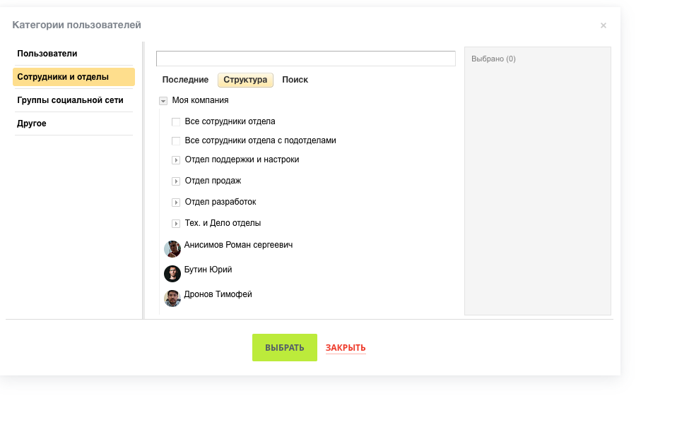 - Добавлена возможность указывать отдел целиком, а не пользователей по отдельности